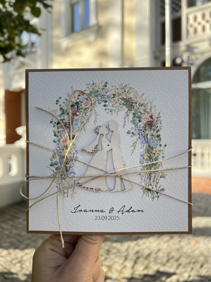 Kartka ślubna wykonana na bazie papieru kraftowego z dodatkiem papieru bawełnianego oraz tekturkowej ozdoby. W zestawie z kopertą.