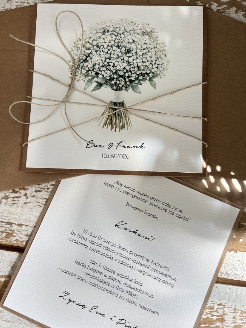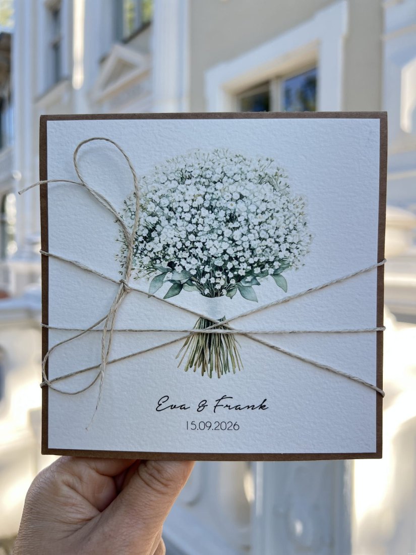 Kartka ślubna wykonana na bazie papieru kraftowego z dodatkiem papieru bawełnianego oraz nadruku grafiki. W zestawie z kopertą.