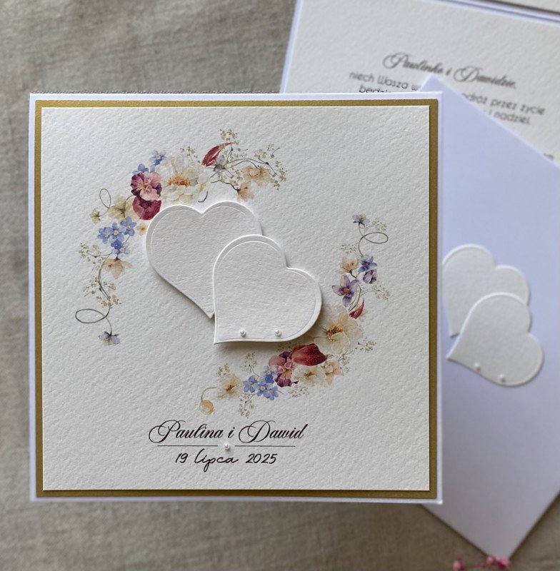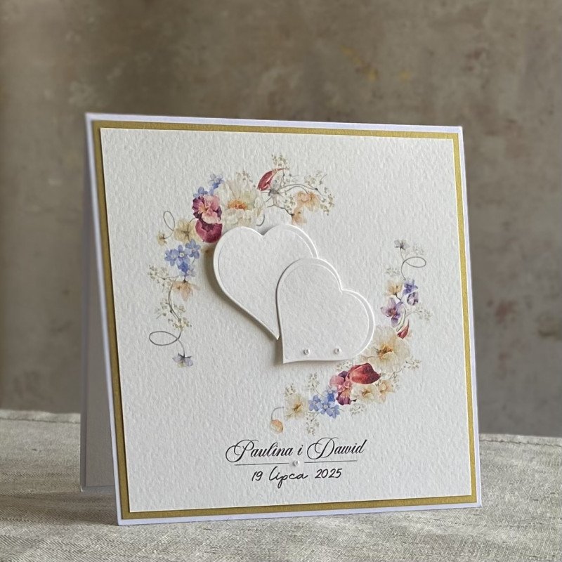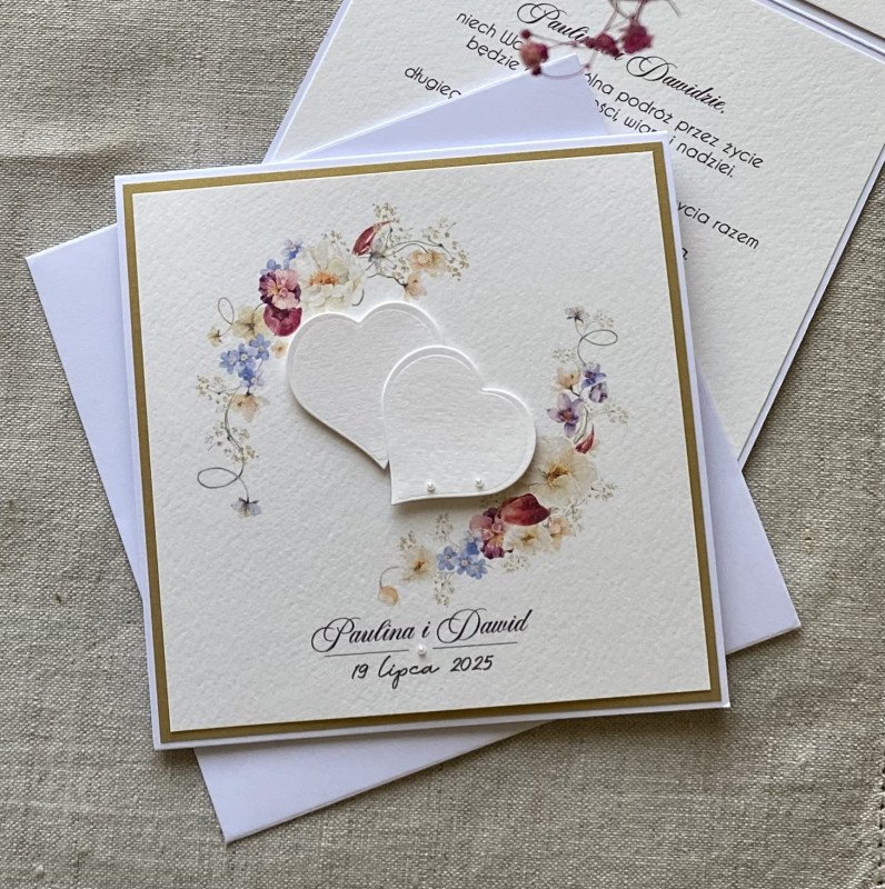Elegancka, ręcznie wykonana, personalizowana kartka z okazji ślubu w ozdobnej kopercie.