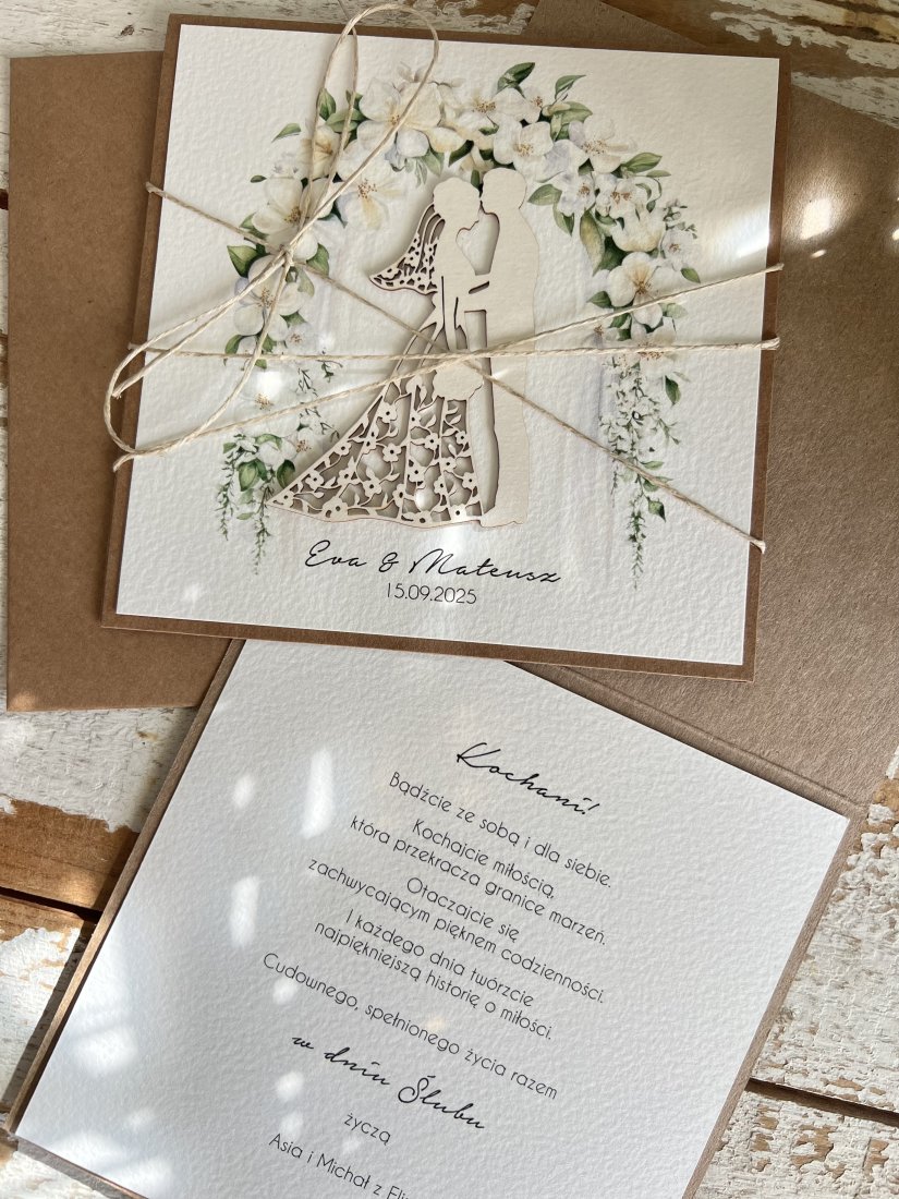 Kartka ślubna wykonana na bazie papieru kraftowego z dodatkiem papieru bawełnianego oraz tekturkowej ozdoby. W zestawie z kopertą.