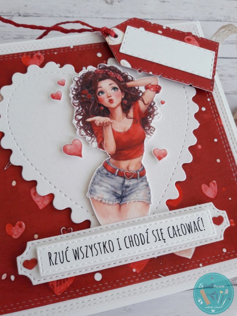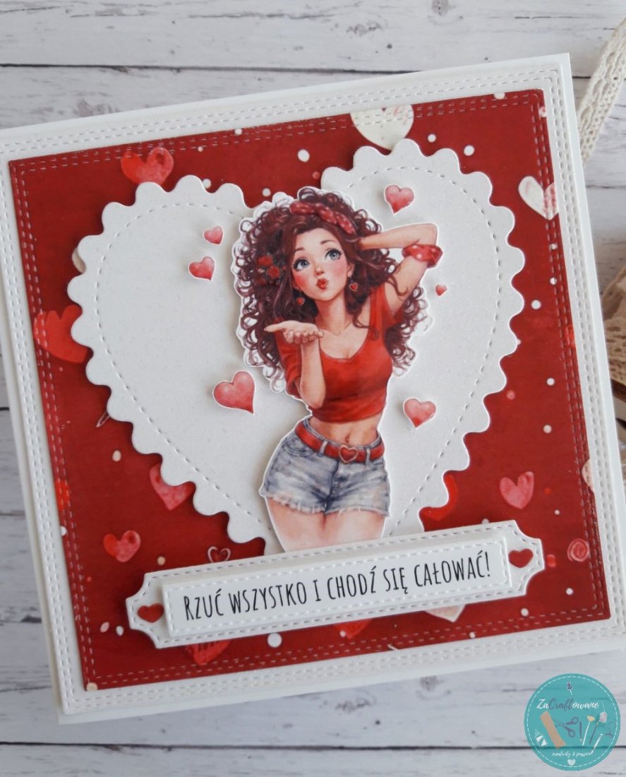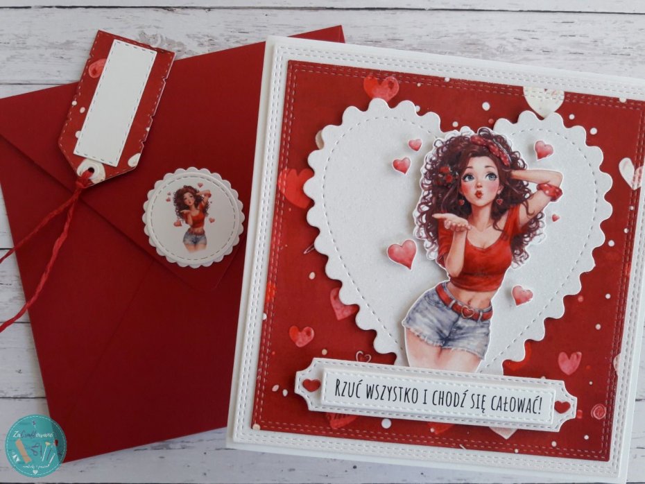 Ręcznie robiona kartka walentynkowa z całuśną dziewczyną wykonana metodą scrapbookingu z wykorzystaniem profesjonalnych materiałów i z dbałością o każdy szczegół.