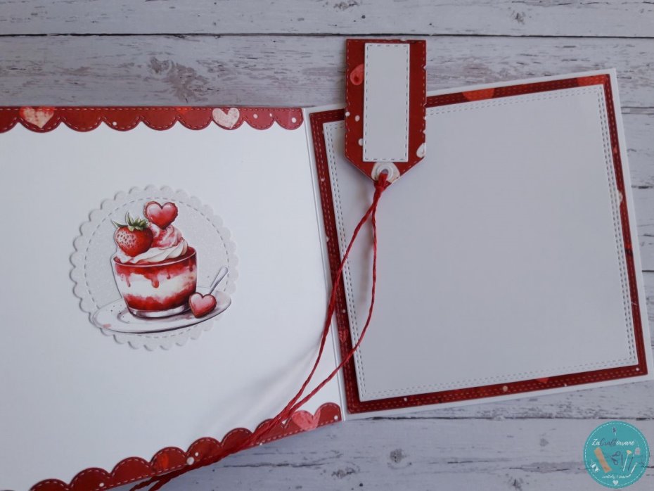 Do kartki dołączam GRATIS w postaci widocznej na zdjęciu etykietki, za pomocą której można podpisać upominek walentynkowy i przyczepić ją do wstążki, którą obwiązany jest prezent, za pomocą sznureczka, który również znajduje się w zestawie.