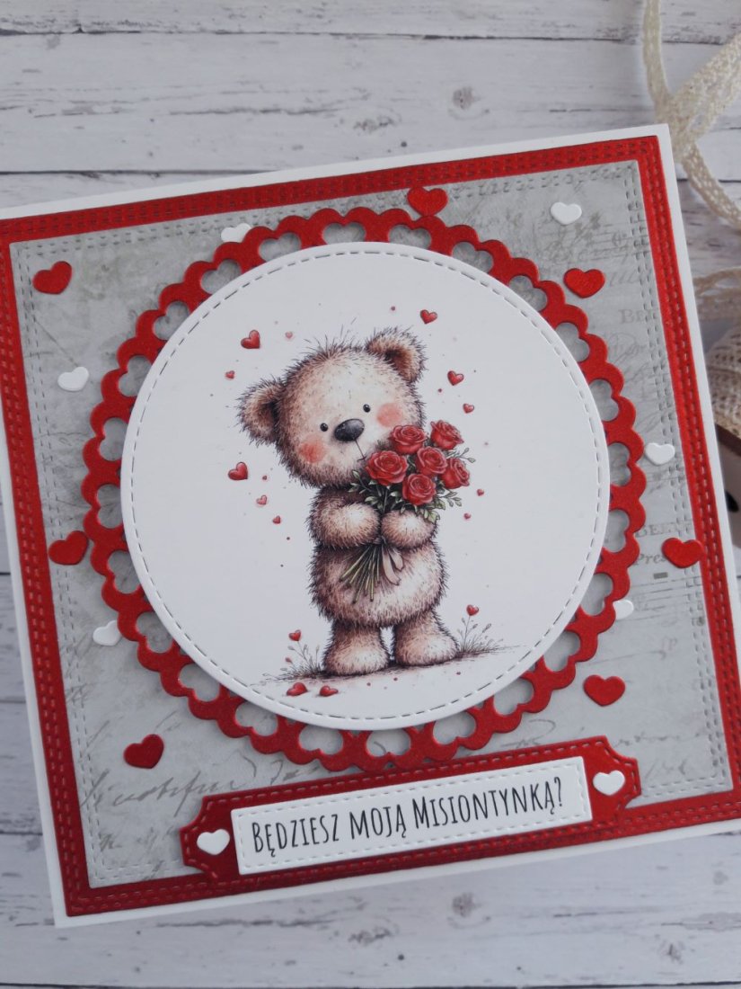 Ręcznie robiona kartka walentynkowa z uroczym misiem wykonana metodą scrapbookingu z wykorzystaniem profesjonalnych materiałów i z dbałością o każdy szczegół.