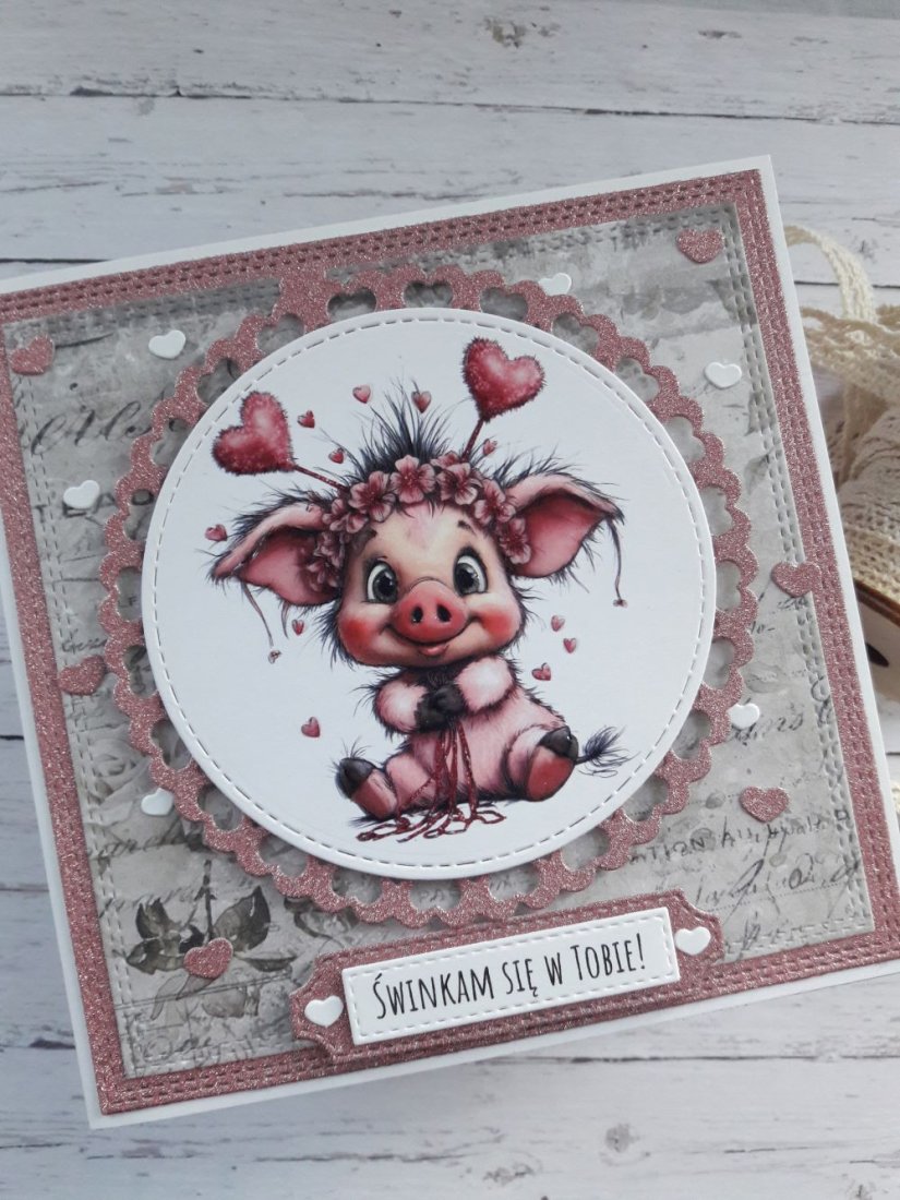 Ręcznie robiona kartka walentynkowa z uroczą świnką wykonana metodą scrapbookingu z wykorzystaniem profesjonalnych materiałów i z dbałością o każdy szczegół.