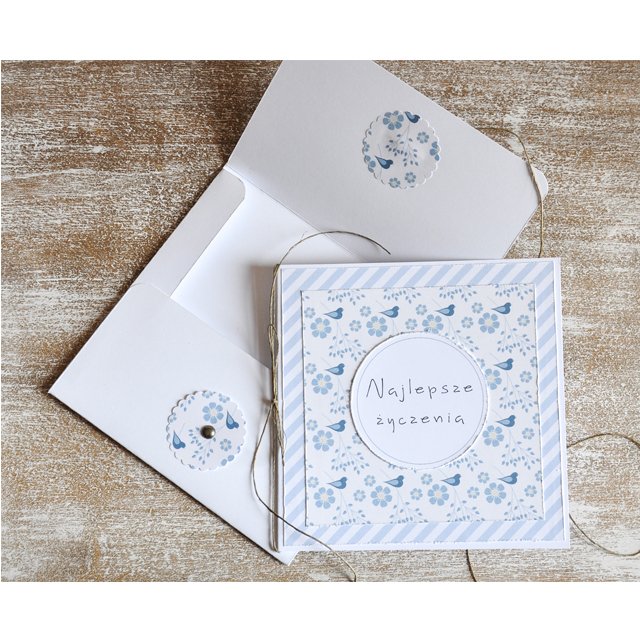 Kartka okazjonalna, otwierana w komplecie z kopertą przewiązywaną o wymiarach 14 cm x 14 cm.