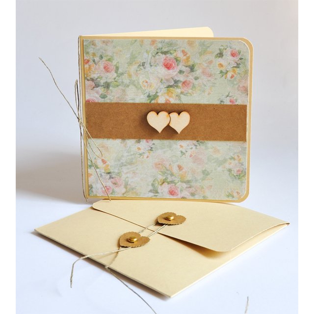 Kartka okazjonalna, otwierana w komplecie z kopertą przewiązywaną o wymiarach 14 cm x 14 cm.