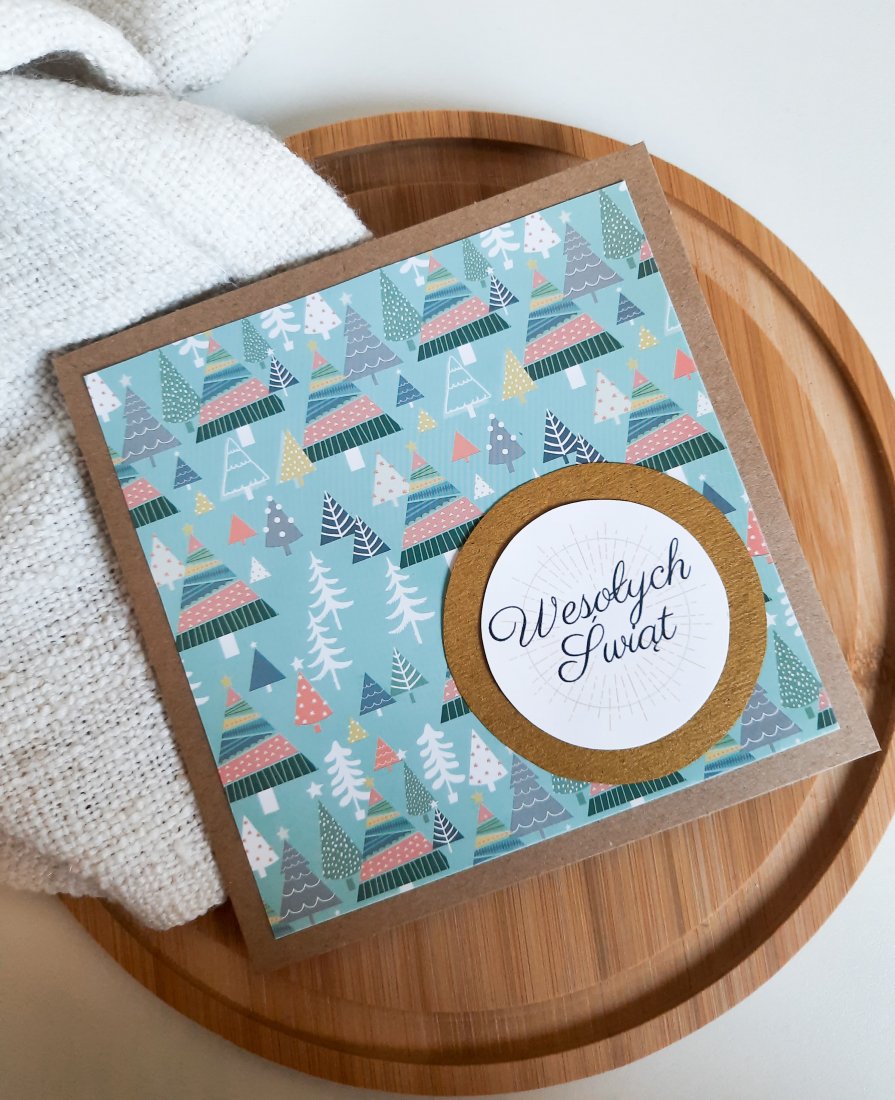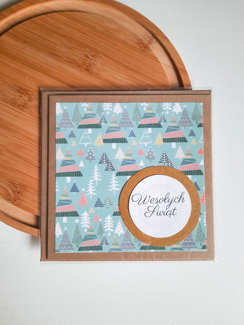 Urocza, ręcznie wykonana Kartka Świąteczna w wesołych, naturalnych barwach z grafiką choinek