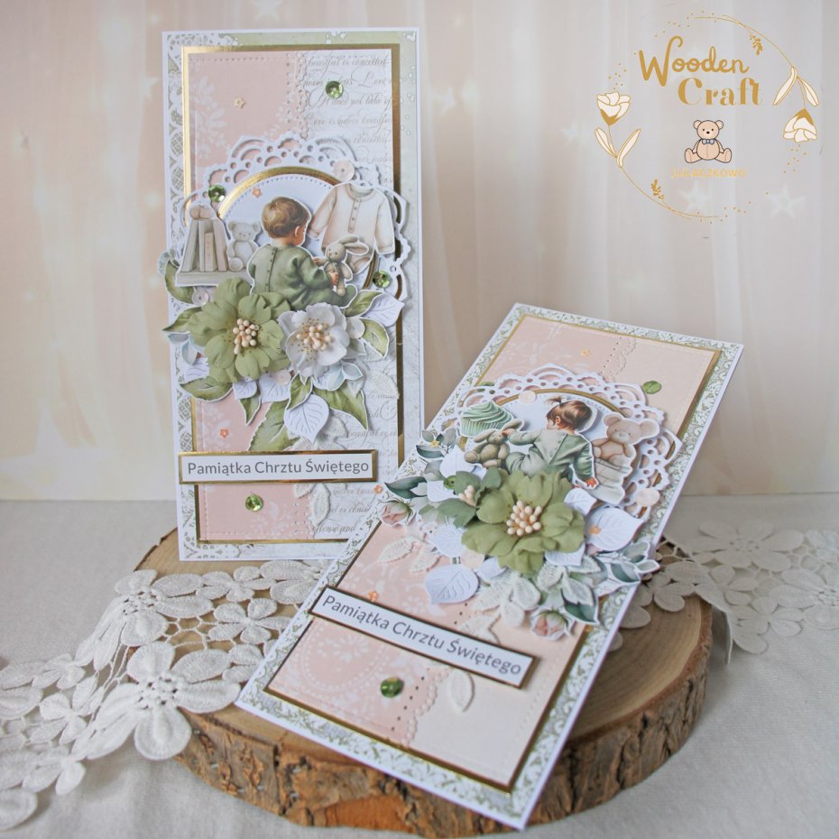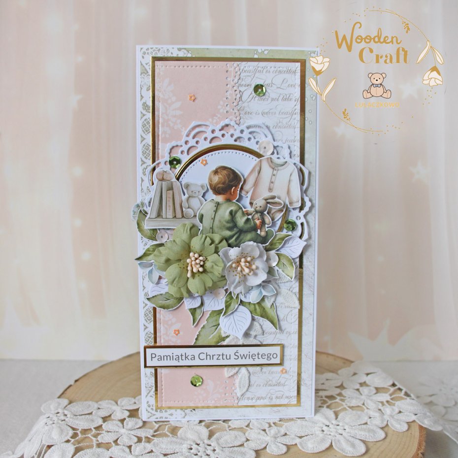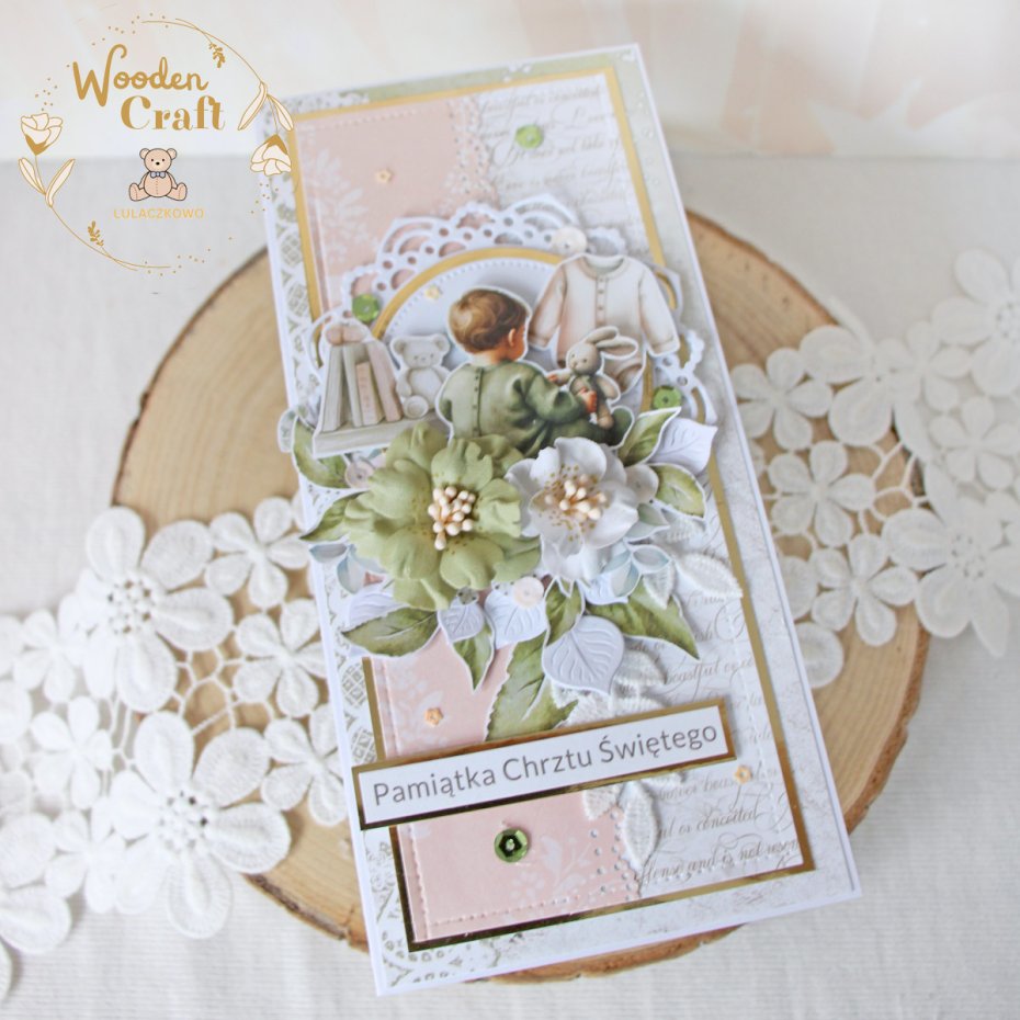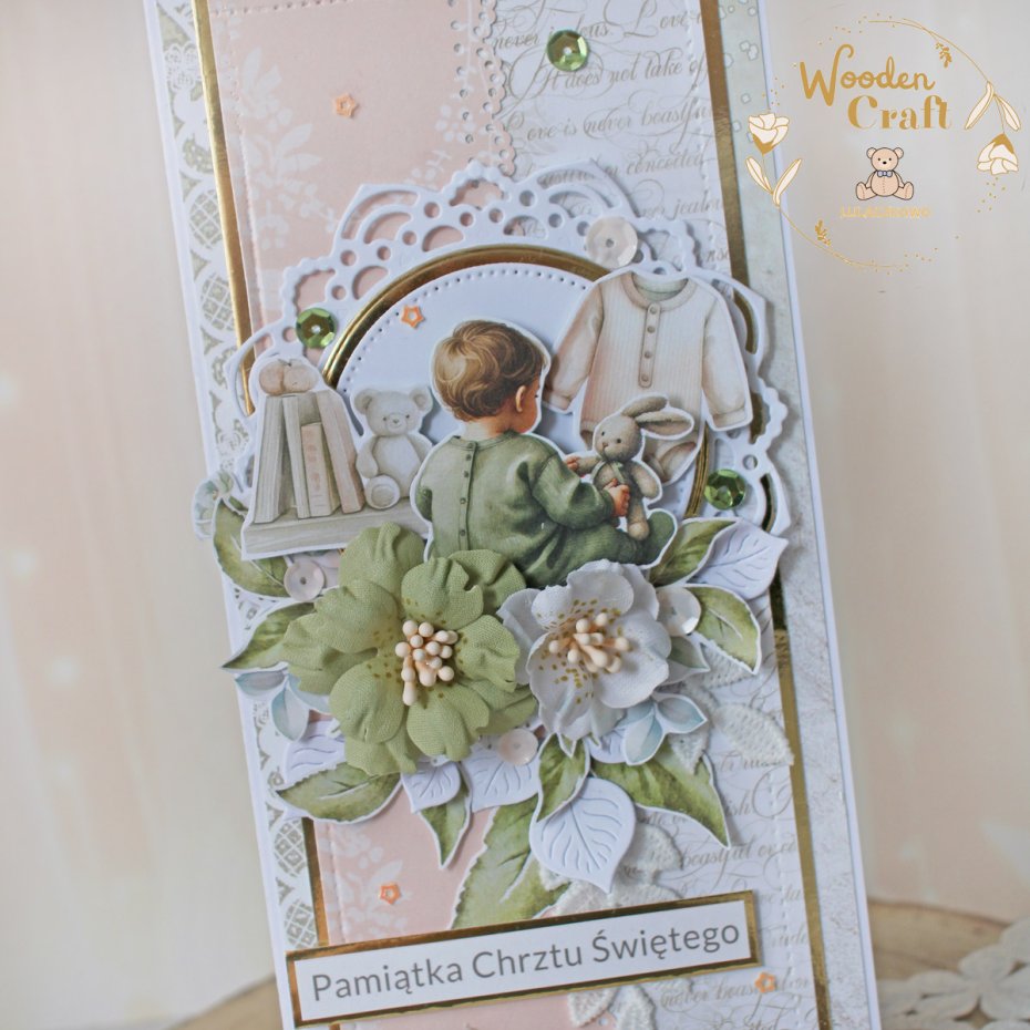 Przepiękna pamiątka chrztu świętego, roczku bądź narodzin w pięknych odcieniach brzoskwini, zgaszonej zieleni i bieli z dodatkiem złotych, błyszczących akcentów. Kartka wykonana z mixu dziecięcych kolekcji papierów.