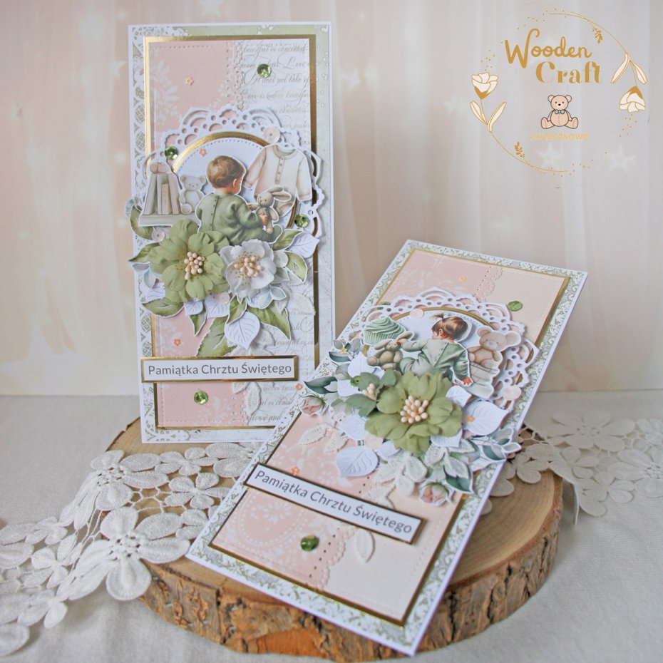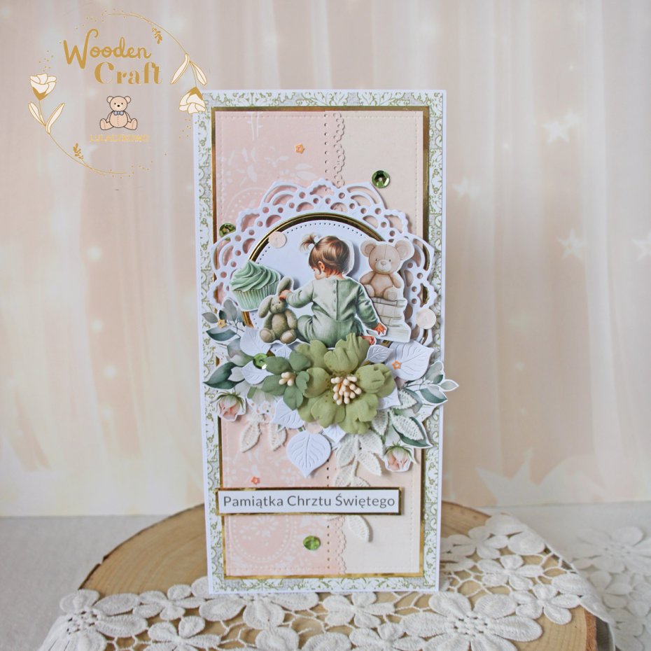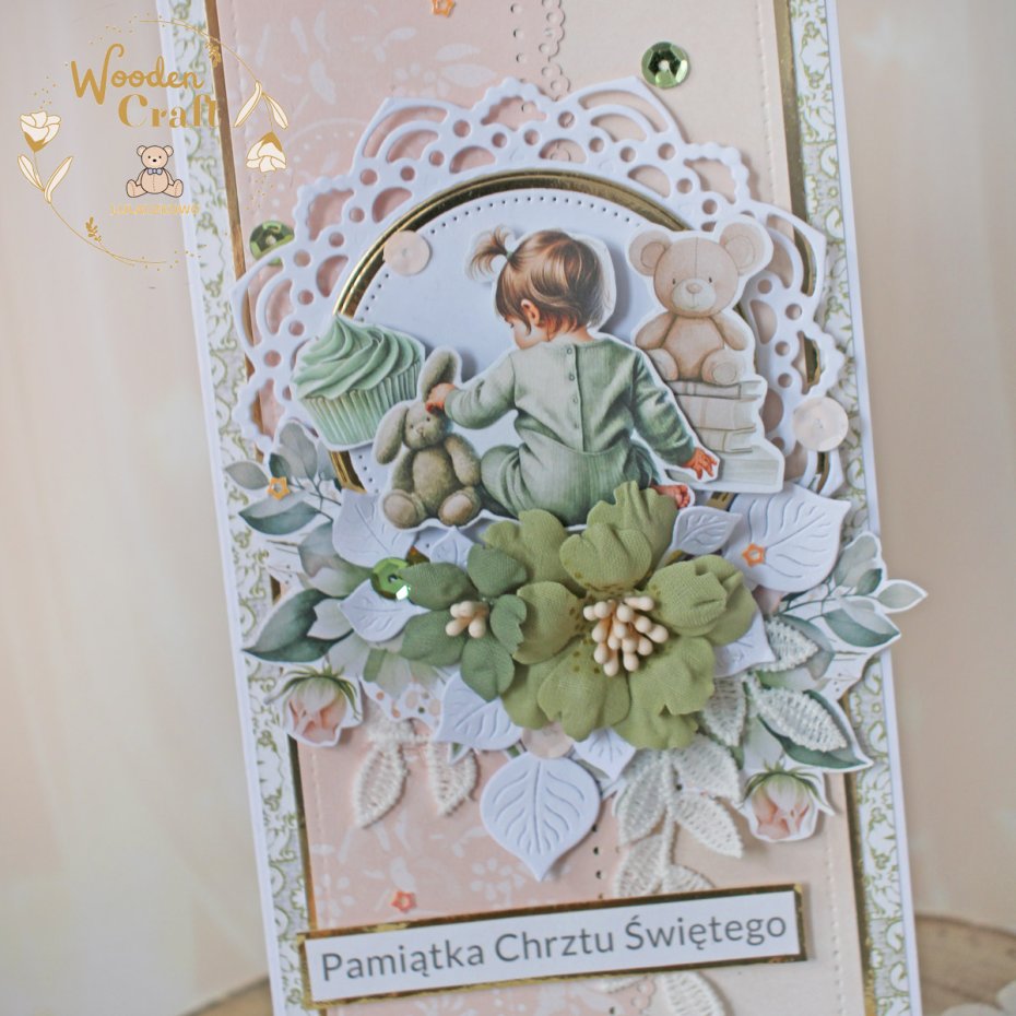 Przepiękna pamiątka chrztu świętego, roczku bądź narodzin w pięknych odcieniach brzoskwini, zgaszonej zieleni i bieli z dodatkiem złotych, błyszczących akcentów. Kartka wykonana z mixu dziecięcych kolekcji papierów.