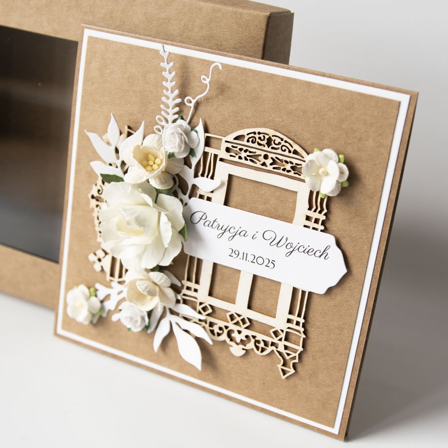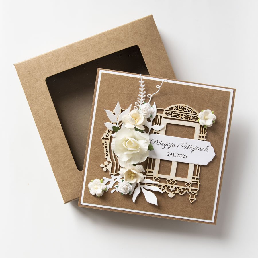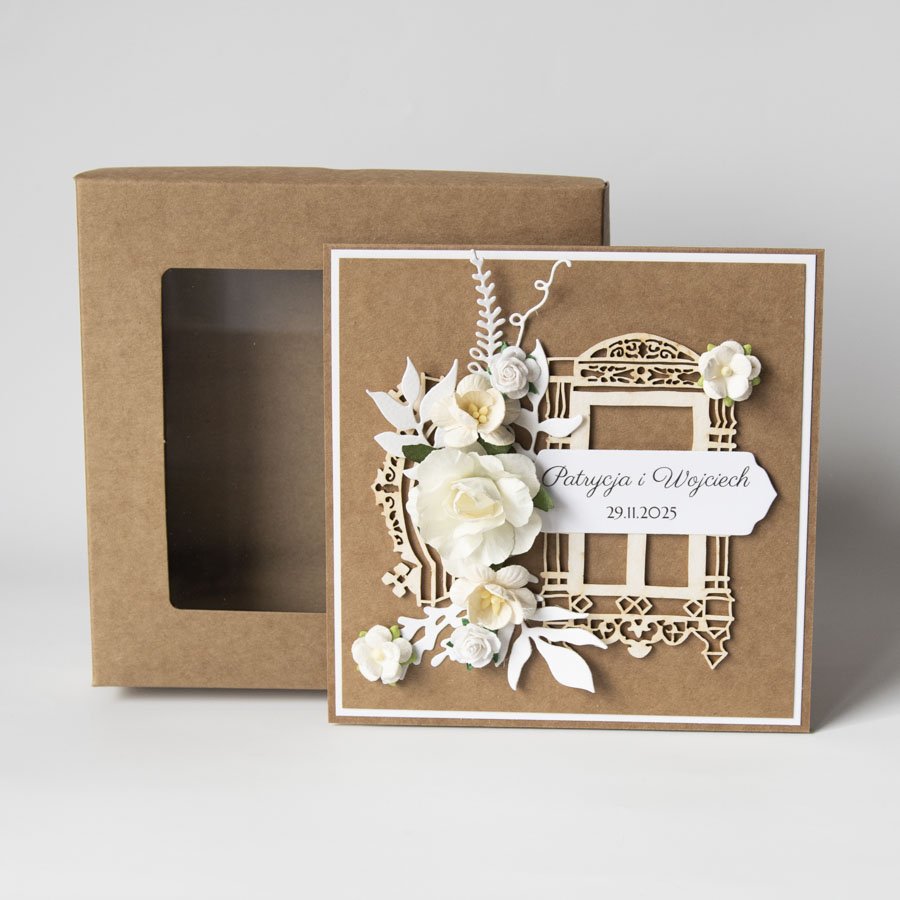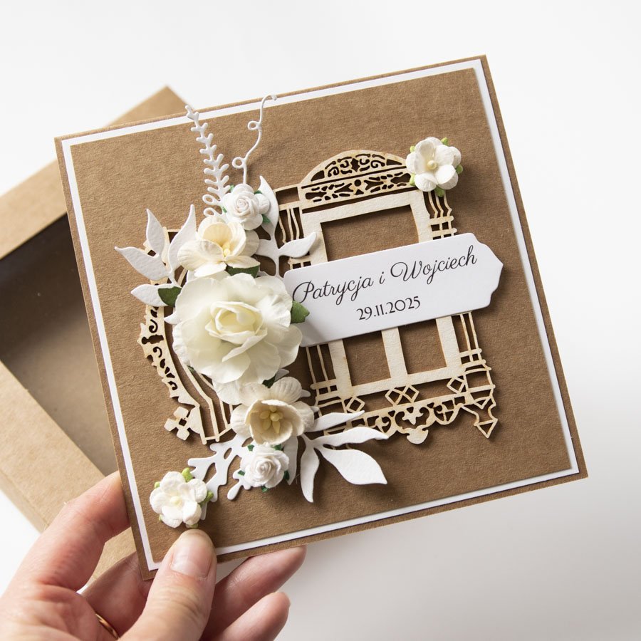 Ręcznie robiona kartka ślubna w komplecie z pudełeczkiem. Kartka utrzymana jest w naturalnej kolorystyce, zdobiona jest kompozycją eleganckich ornamentów i papierowych kwiatów.