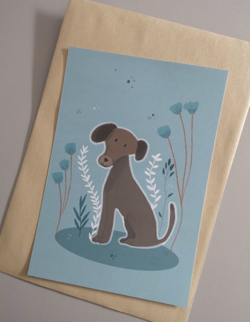 Kartka z ilustracją ślicznego pieska o wymiarach 12,5x 18,5 cm.