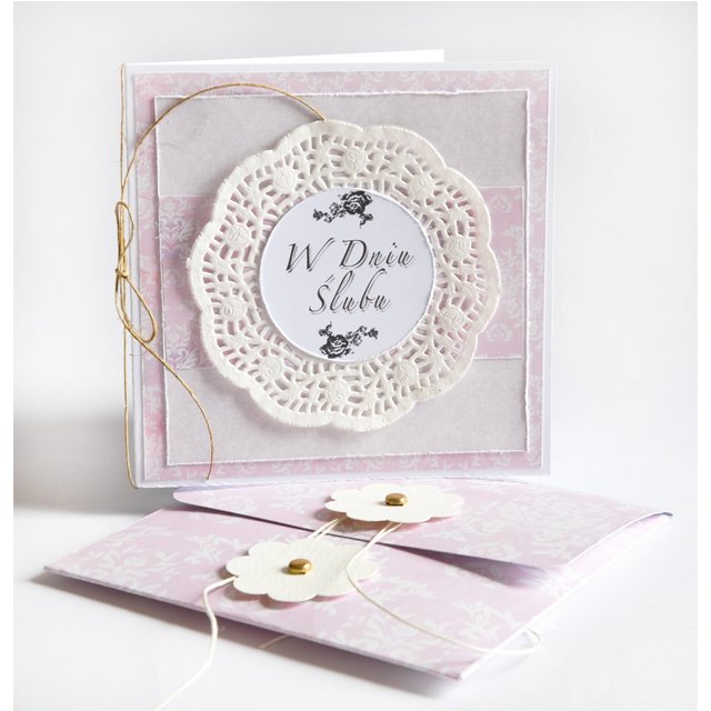 Kartka ślubna otwierana. W komplecie koperta przewiązywana o wymiarach 14 cm x 14 cm.
