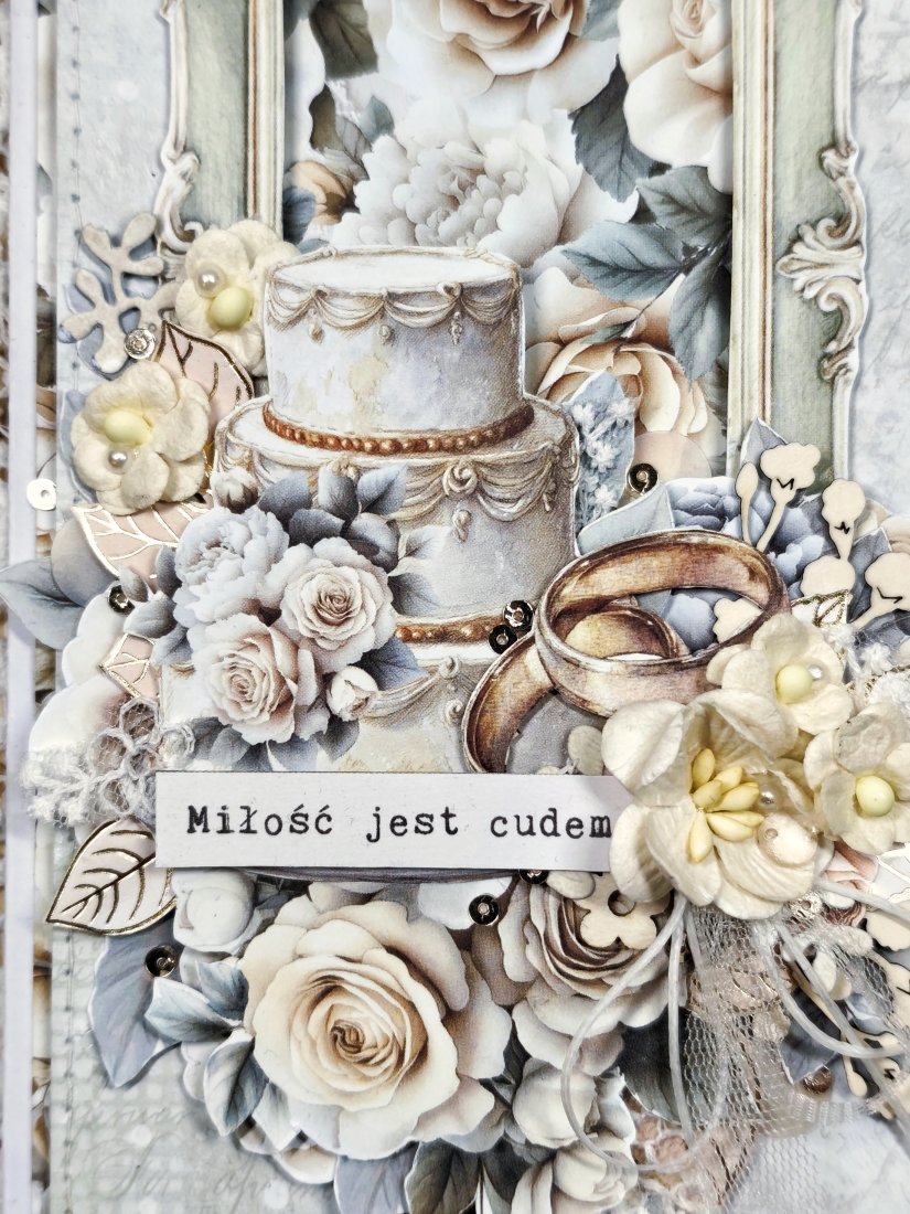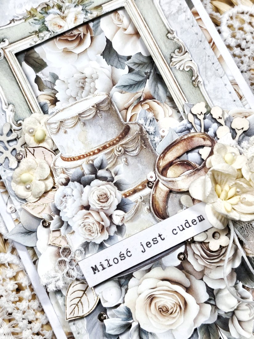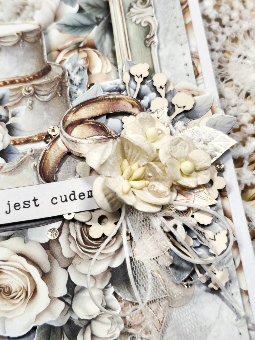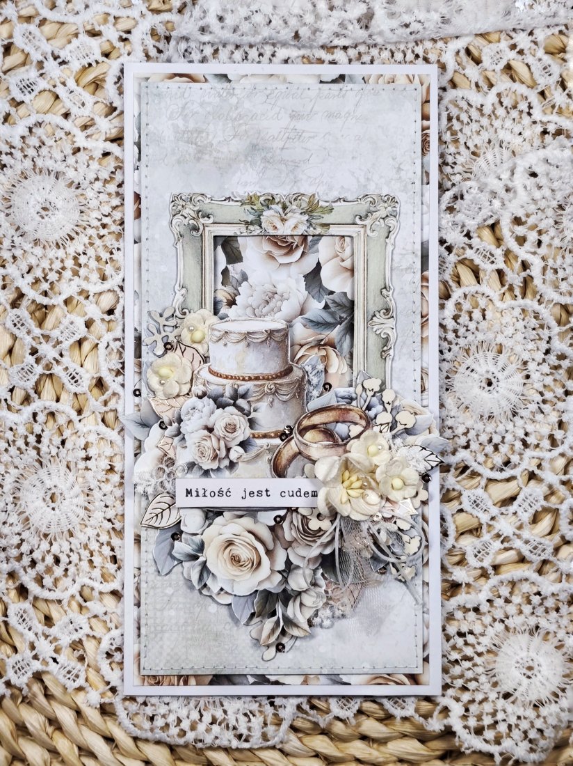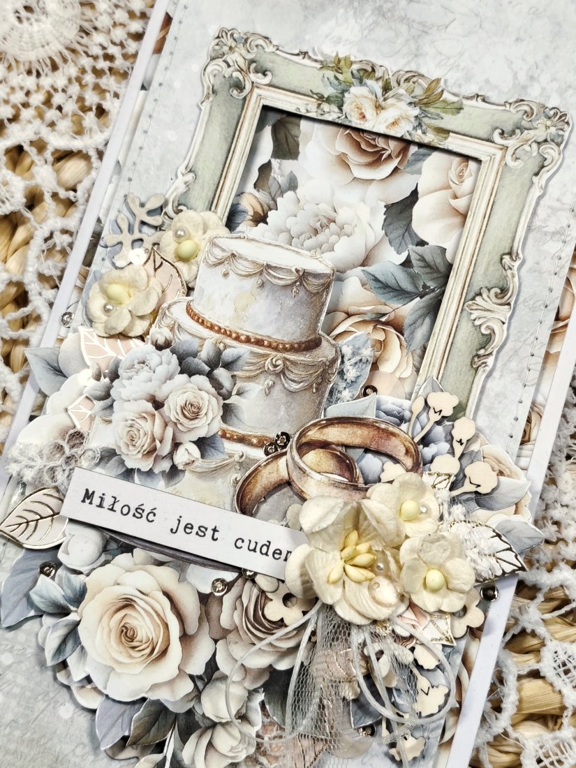 Każda kartka posiada unikalną kompozycję, wykonaną z delikatnej koronki oraz eleganckich kwiatków. Nie ma dwóch identycznych kartek — każda jest jedyna w swoim rodzaju.