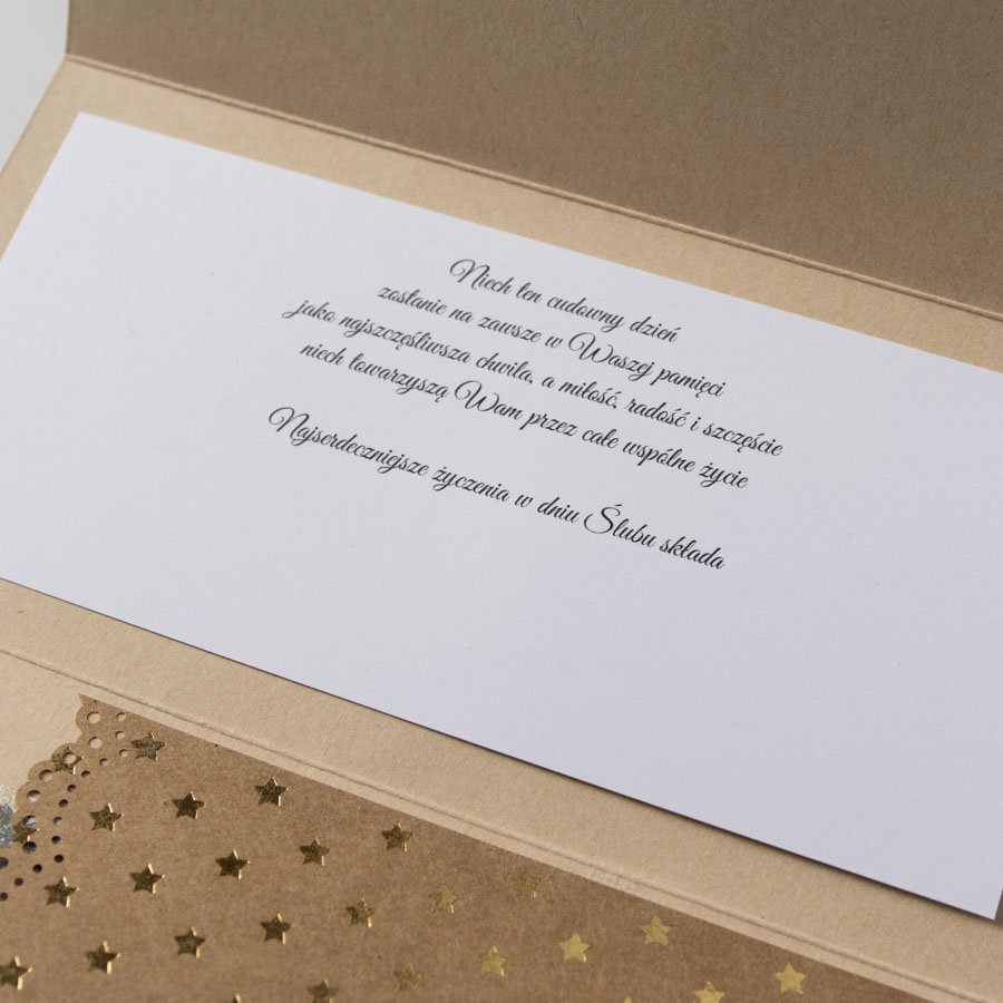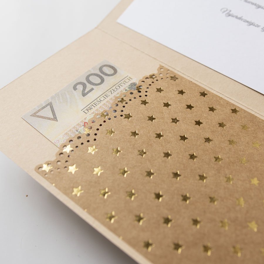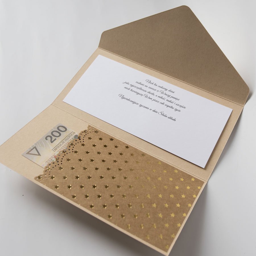 Kartka ma formę rozkładanego folderu, w środku znajduje się miejsce na życzenia oraz miejsce na pieniądze (kieszonka z wzorzystego papieru).