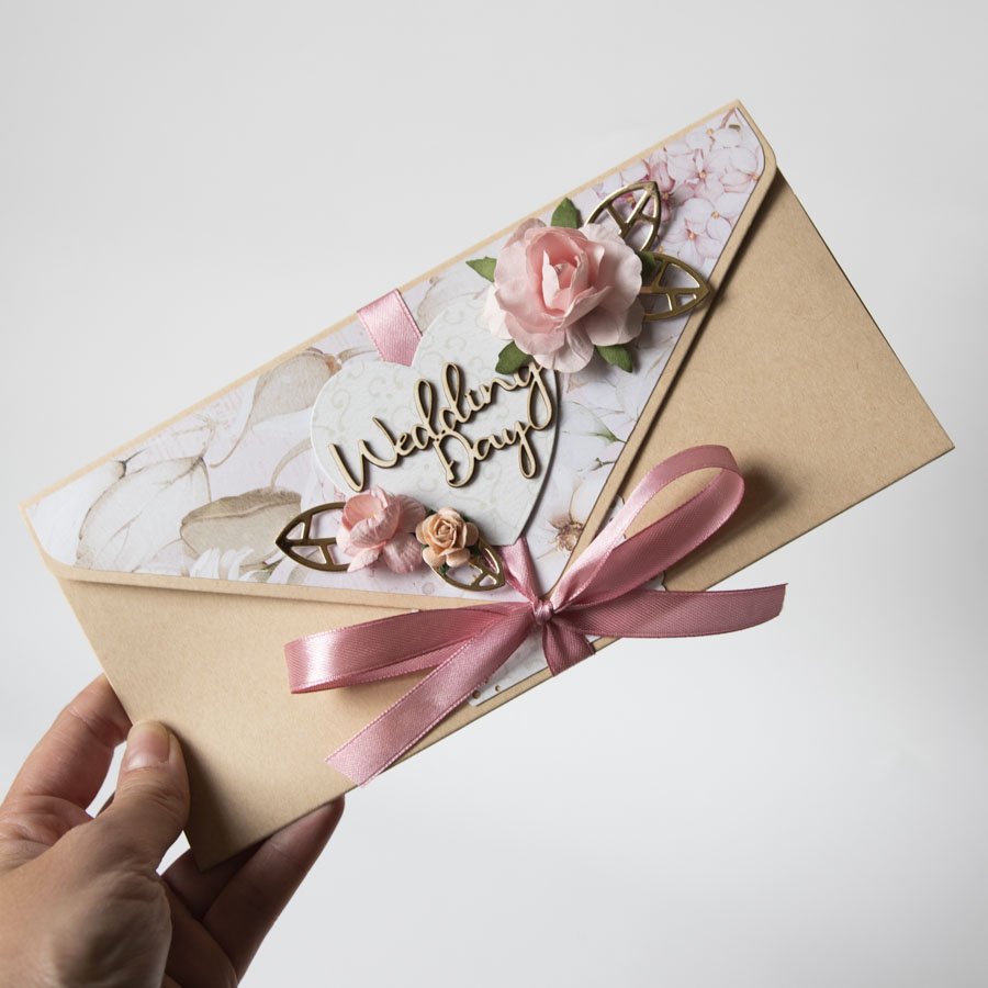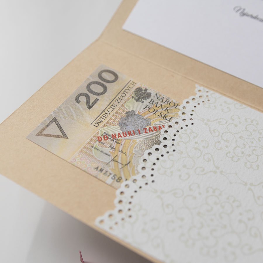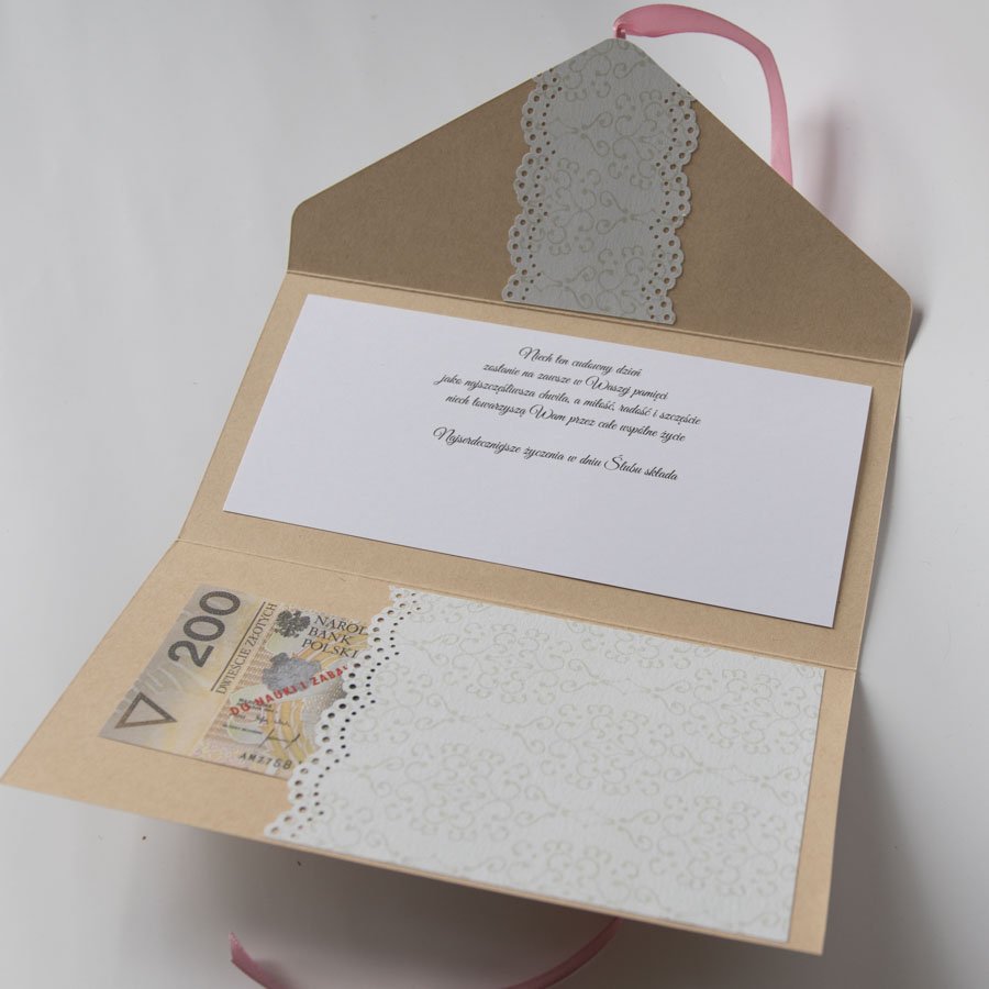 Kartka ma formę rozkładanego folderu, w środku znajduje się miejsce na życzenia oraz miejsce na pieniądze (kieszonka z wzorzystego papieru).