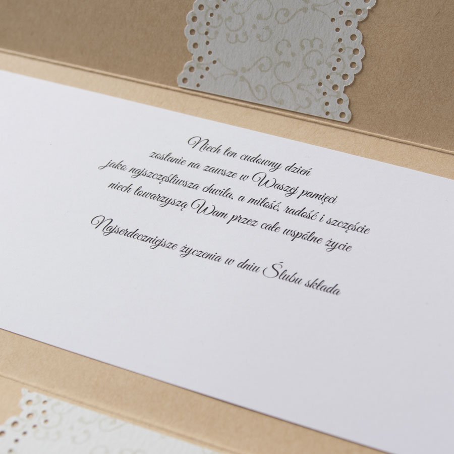 Po złożeniu kartkę przewiązuje się satynową wstążką.