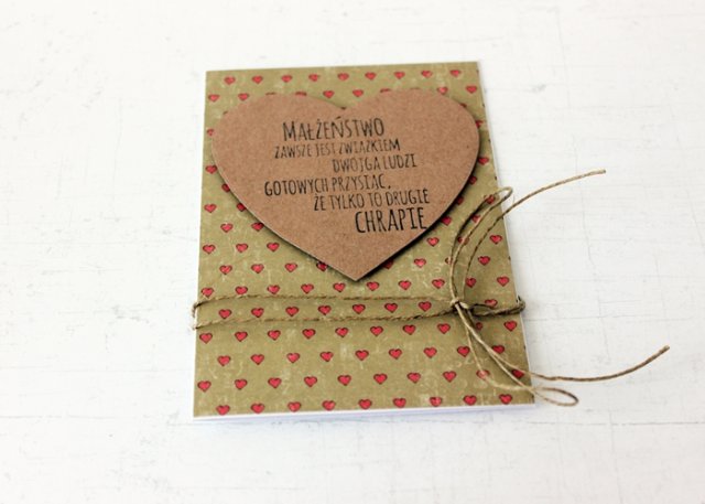 Bardzo prostka kartka ślubna z zabawnym cytatem T. Pratchetta. Ozdobiona papierem w maleńkie czerwone serduszka oraz przewiązana dratwą. Idealna dla Pary Młodej z poczuciem humoru lub miłośników tego pisarza.