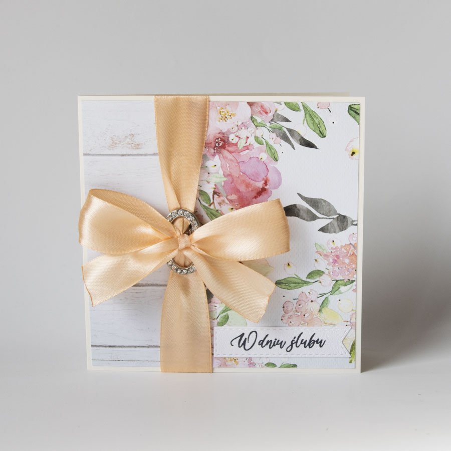 Ręcznie robiona kartka ślubna, niepowtarzalny egzemplarz! Zdobi ją duża satynowa kokarda z kryształkami.