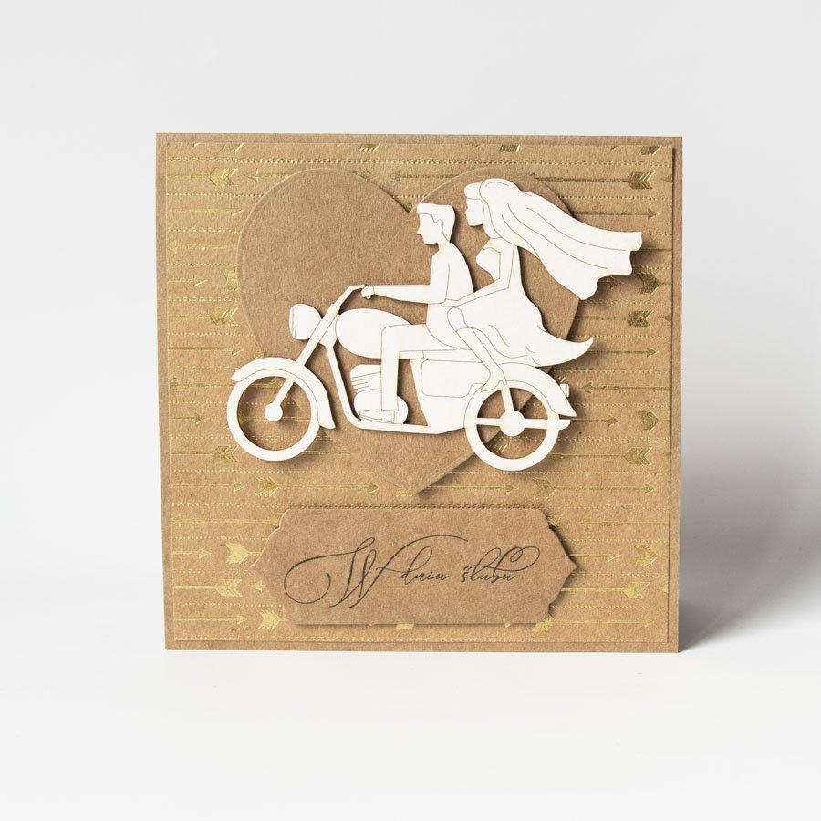 Ręcznie robiona kartka slubna, niepowtarzalny egzemplarz! Zdobi ją pięknie połyskujący złocony papier oraz przestrzenna dekoracja przedstawiająca parę młodą na motorze.