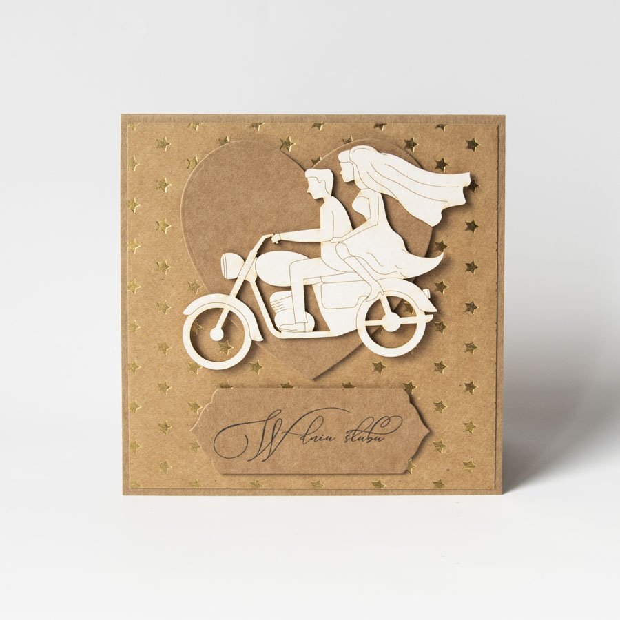 KARTKA ŚLUBNA Z PARĄ MŁODĄ NA MOTORZE MOTOCYKLU