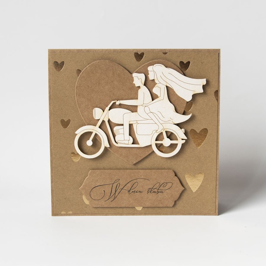 Ręcznie robiona kartka slubna, niepowtarzalny egzemplarz! Zdobi ją pięknie połyskujący złocony papier oraz przestrzenna dekoracja przedstawiająca parę młodą na motorze.