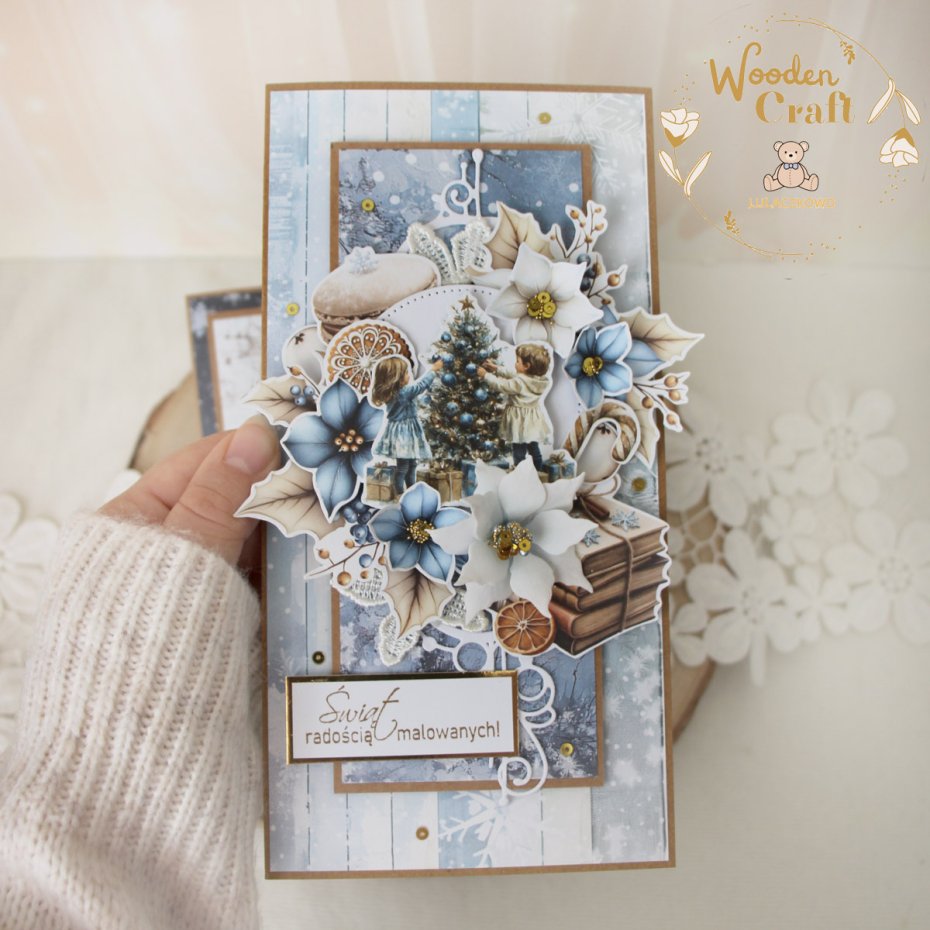 Przepiękna, bogato zdobiona kartka na Boże Narodzenie z motywem dzieci dekorujących choinkę. Kartka wykonana ręcznie, techniką scrapbookingu, z dbałością o każdy szczegół, z najnowszej kolekcji papierów "Jolly Season". Kartka ozdobiona kwiatowymi grafikami oraz ręcznie wykonanymi ponsecjami, udekorowana połyskującymi złotymi cekinami oraz napisem "Świąt radością malowanych". Elementy są klejone warstwowo, dzięki czemu kartka daje lekki efekt 3D,