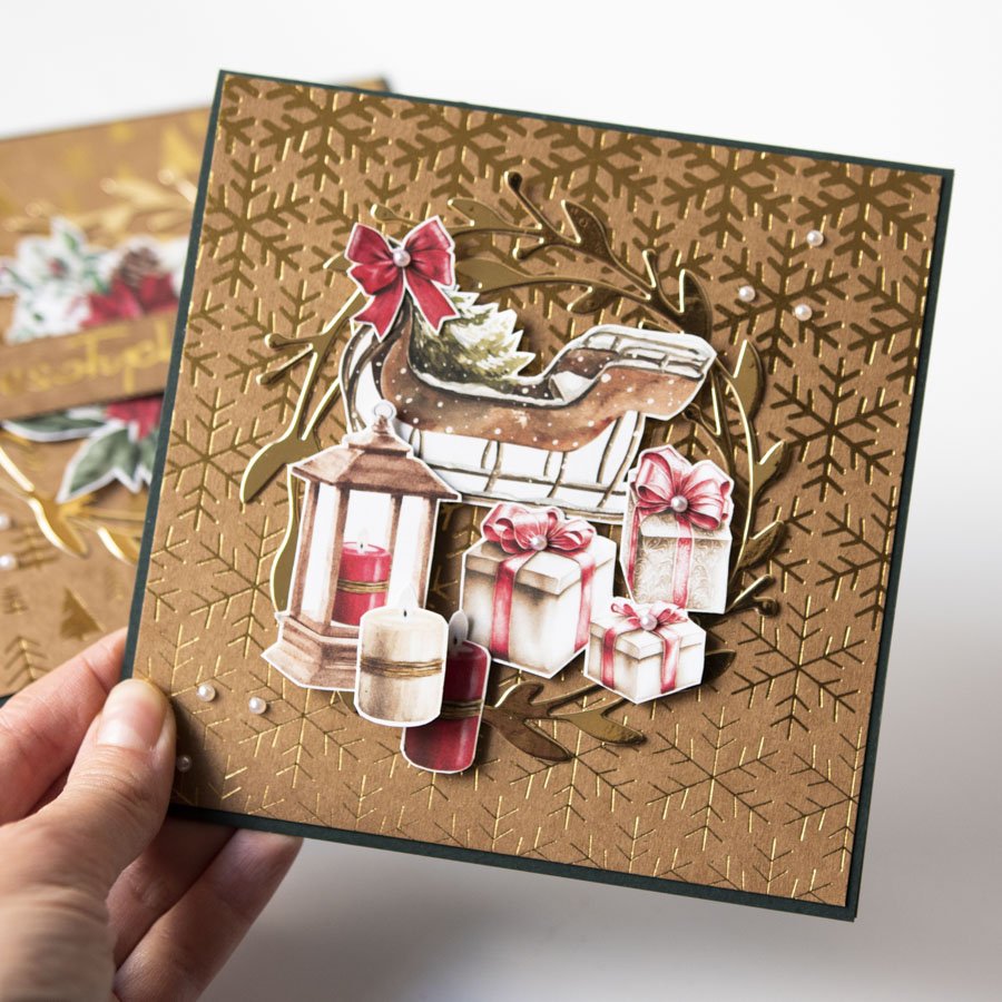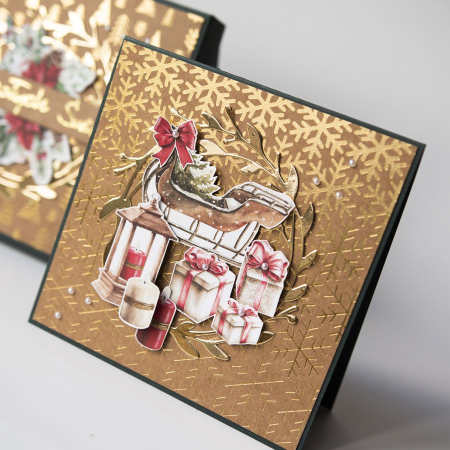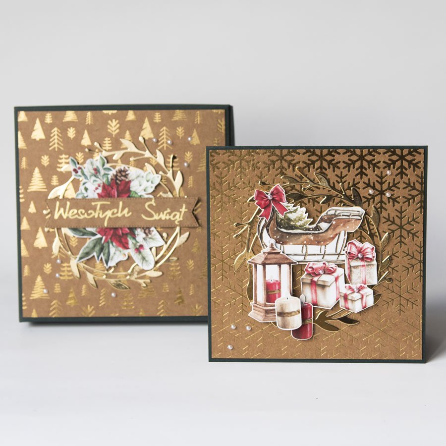 Ręcznie robiona kartka świąteczna w komplecie z dopasowanym pudełeczkiem. Kartka oraz pudełko są wykonane na bazie ciemnozielonego kartonu, zdobione papierem ekologicznym ze złoconymi wzorami i ręcznie wycinanymi papierowymi dekoracjami.