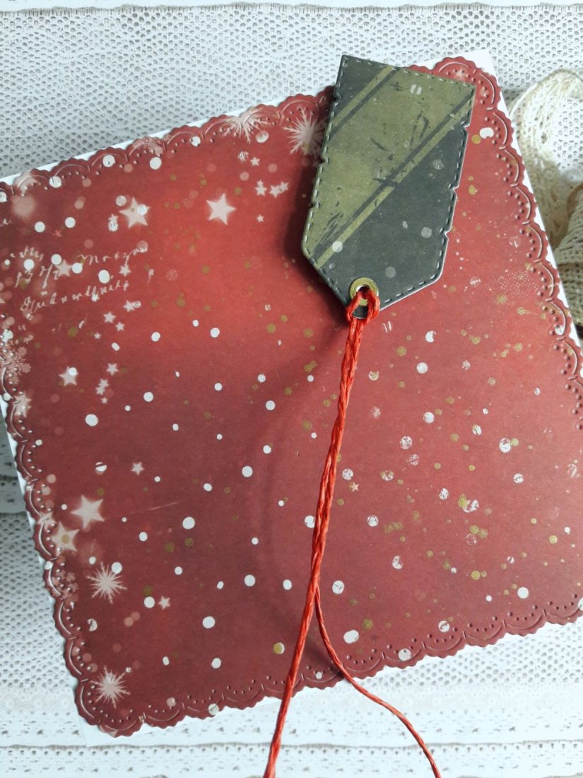 Do kartki dołączam również GRATIS w postaci 1 widocznej na zdjęciu etykietki, na której można wypisać imię osoby obdarowywanej świątecznym prezentem i przyczepić ją do wstążki, którą obwiązany jest upominek, za pomocą sznureczka, który również znajduje się w zestawie.