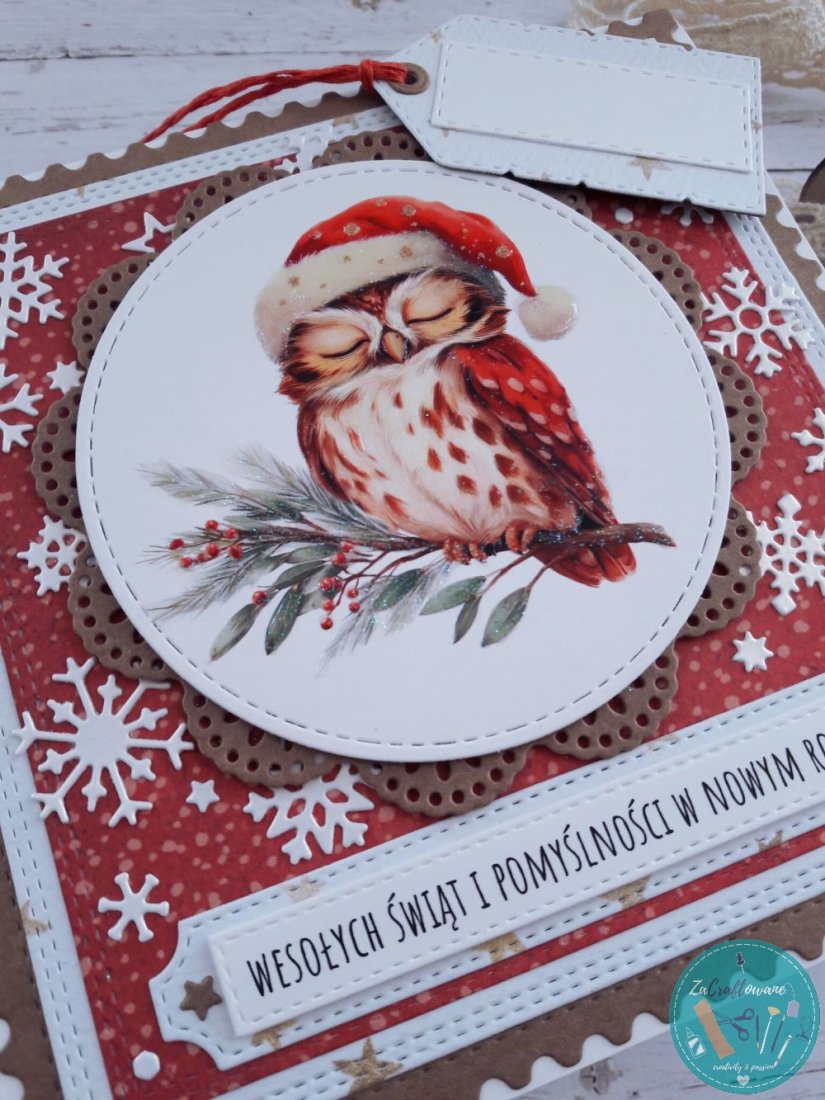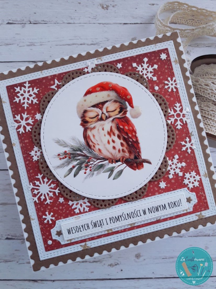 Kartka bożonarodzeniowa z sową wykonana metodą scrapbookingu z wykorzystaniem profesjonalnych materiałów i z dbałością o każdy szczegół.