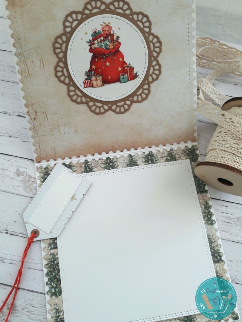 Wnętrze i tył kartki także zostały ozdobione. Śnieżynki są wycięte z kremowego papieru z delikatnym perłowym połyskiem. Grafika jest wykończona preparatem szklącym i brokatem, dzięki czemu całość, mimo naturalnego wyglądu, będzie się pięknie mienić w blasku światełek choinki.