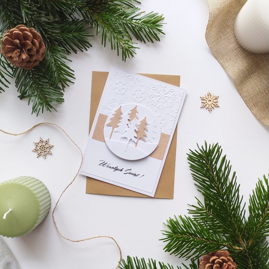 KARTKA ŚWIĄTECZNA ZE ŚNIEGIEM I CHOINKAMI