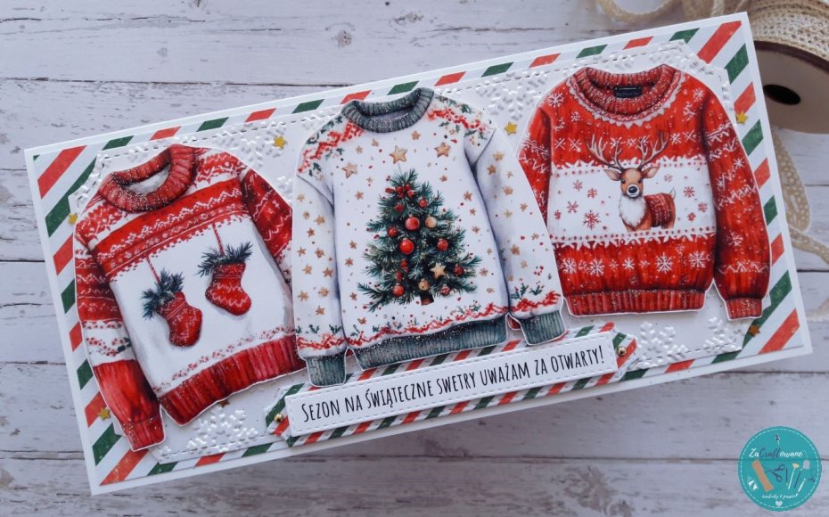 Motywem głównym kartki są swetry świąteczne z różnymi motywami bożonarodzeniowymi.