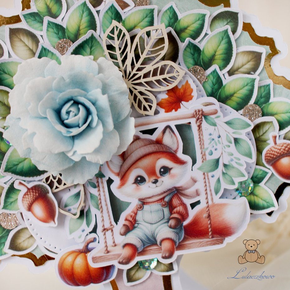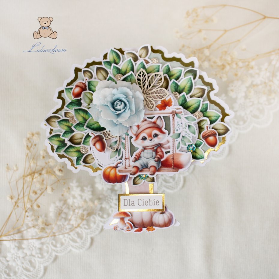 Piękna i nietuzinkowa, dziecięca kartka urodzinowa, wykonana z miksu dziecięcych kolekcji papierów, utrzymana w odcieniach zieleni, brązu i bieli z dodatkiem błyszczących, złotych akcentów. Kartka wykonana ręcznie z dbałością o każdy szczegół. Na środku znajduje się grafika uroczego liska siedzącego na huśtawce, ozdobiona kompozycją kwiatową z ręcznie wykonaną, foamiranową różą, dodatkowo zdobiona tekturkami, a także napisem "Dla Ciebie" (na życzenie mogę dodać również imię dziecka, lub całkowicie zmienić napis na inny).