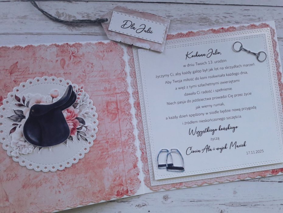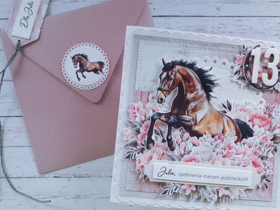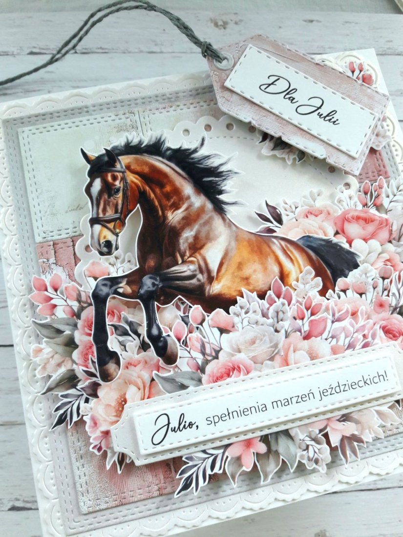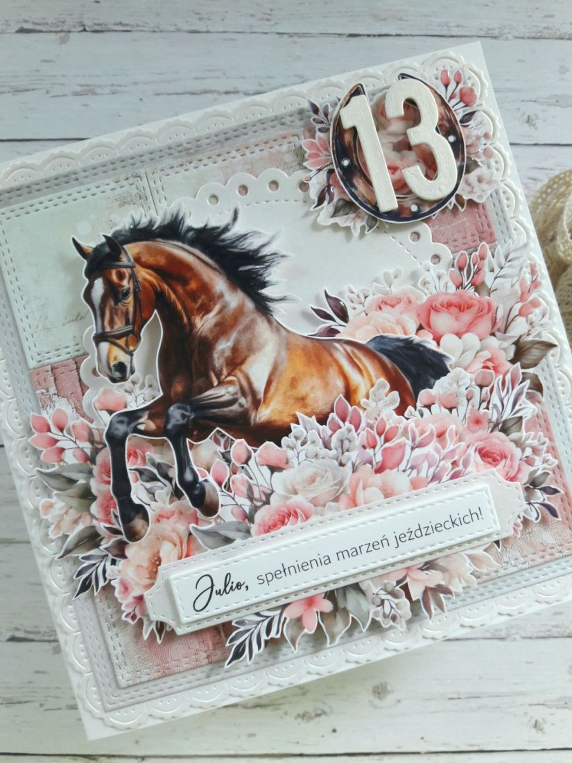 Warstwowa kartka urodzinowa dla pasjonatki koni z efektem 3D, wykonana metodą scrapbookingu.
