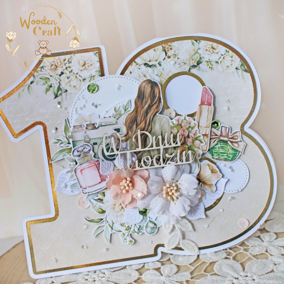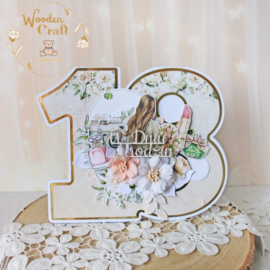 Przepiękna, delikatna kartka na 18 urodziny w kształcie liczby 18, wykonana ręcznie z dbałością o każdy szczegół. Kartka utrzymana w odcieniach beżu, bieli i pudrowego różu, z dodatkiem złotych, błyszczących akcentów, wykonana z najnowszej kolekcji papierów "Simle Story".