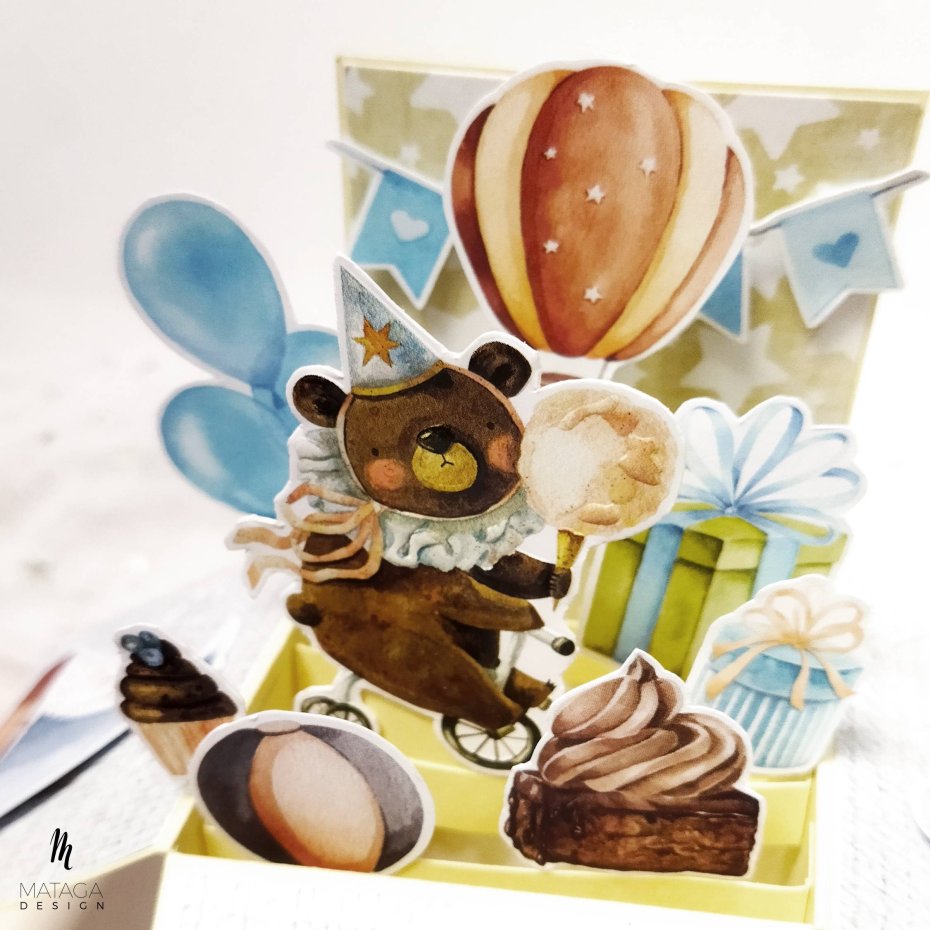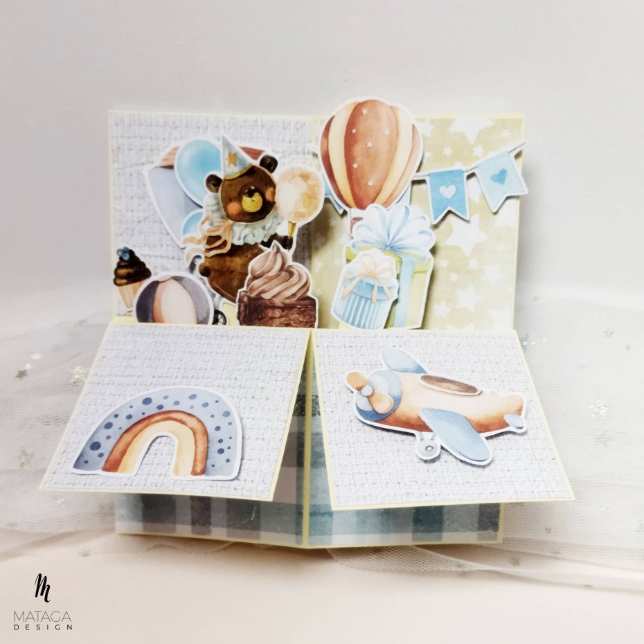 Przedstawiam Wam urodzinową kartkę pop up box dla małego chłopca z motywem misia jadącego na rowerku. Kartka utrzymana w ciepłych kolorach z przewagą niebieskiego z delikatnymi tłoczeniami na klapach pudełka-kartki.