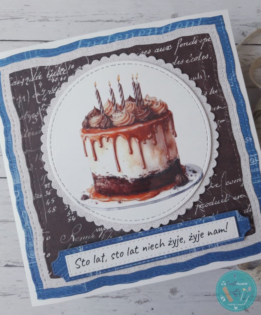 Męska kartka urodzinowa z tortem wykonana metodą scrapbookingu z wykorzystaniem profesjonalnych materiałów i z dbałością o każdy szczegół.