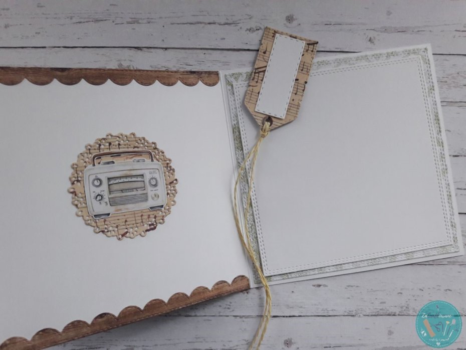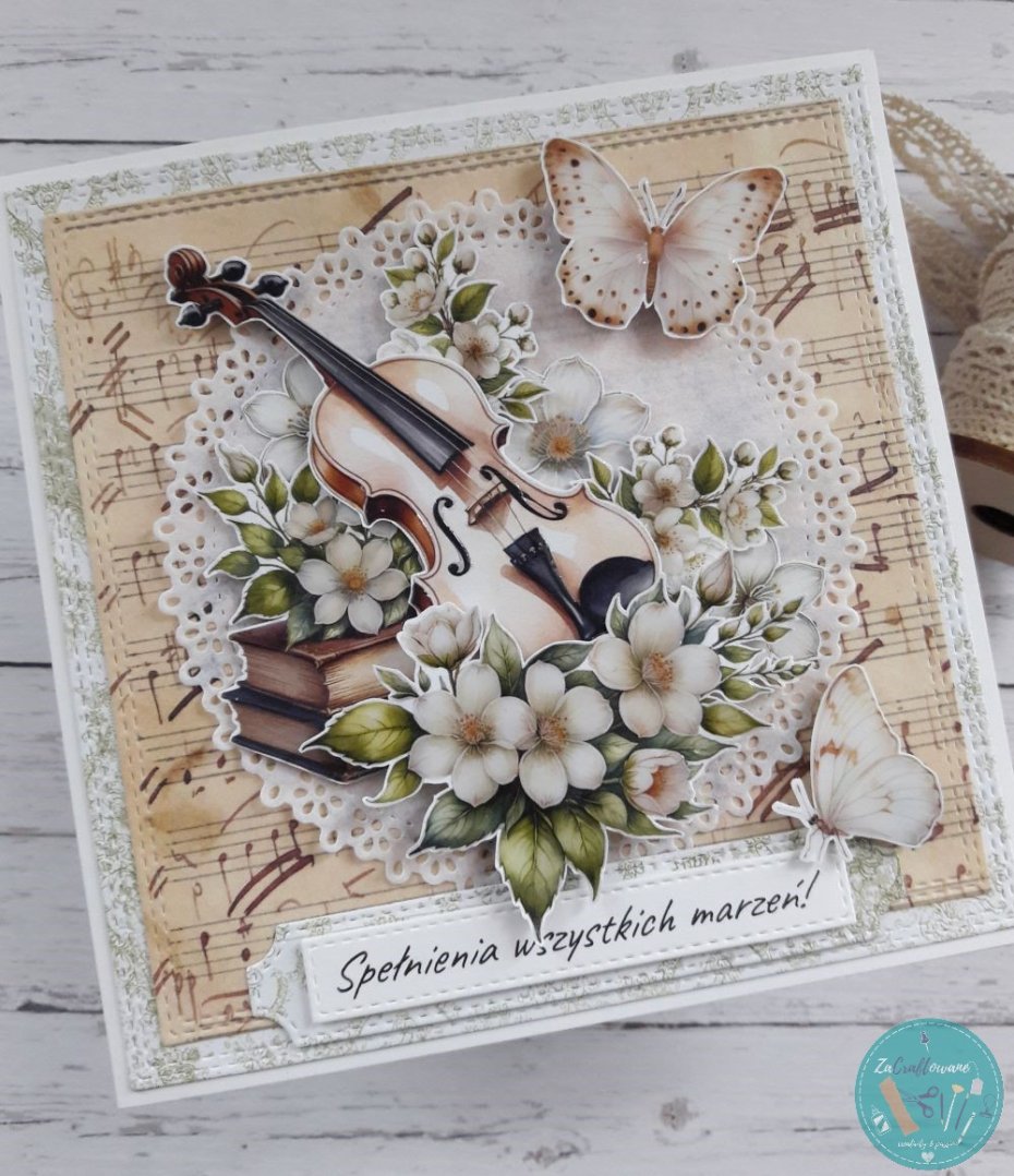Warstwowa kartka urodzinowa ze skrzypcami z lekkim efektem 3D wykonana metodą scrapbookingu z wykorzystaniem profesjonalnych materiałów i z dbałością o każdy szczegół.