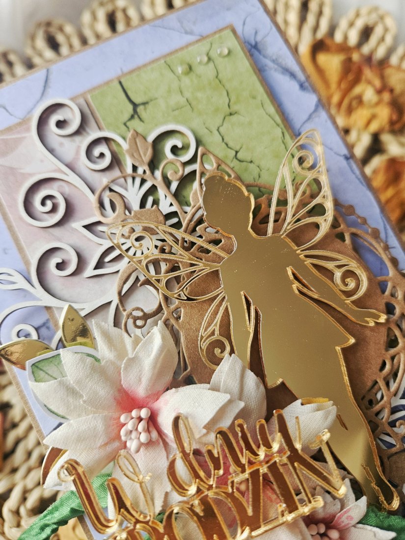 Elegancka kartka z okazji urodzin. Wykonana z papieru z nadrukiem i ozdobiona kwiatami z materiału oraz dodatkami z pleksi.