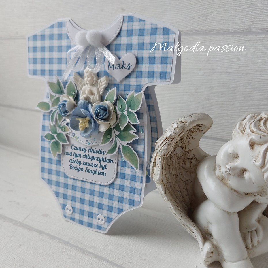 Urocza, niepowtarzalna karteczka w kształcie dziecięcego body. Wykonana z największą starannością ze sztywnych papierów w pastelowej, chłopięcej kolorystyce,100 % ręczna robota. Bodziaczek posiada elementy 3D, a wnętrze kartki także jest ślicznie ozdobione. Posiada miejsce na wpisanie życzeń. Z tyłu kartki znajduje się metryczka urodzeniowa do samodzielnego uzupełnienia. Do karteczki w komplecie dołączona dopasowana kolorystycznie , sztywna koperta. Wymiary zamkniętej kartki 14,5 na 12,5 cm. Serdecznie zapraszam :)