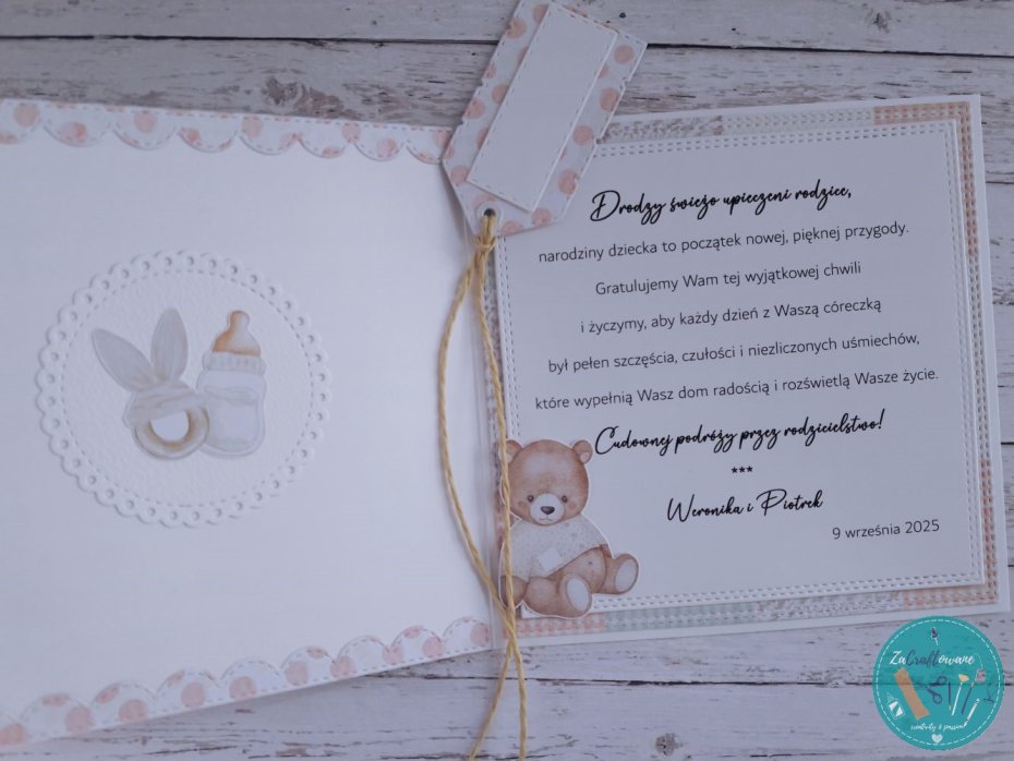 Do kartki dołączam GRATIS w postaci widocznej na zdjęciu etykietki, za pomocą której można podpisać upominek dla maluszka i przyczepić ją do wstążki, którą obwiązany jest prezent, za pomocą sznureczka, który również znajduje się w zestawie.
