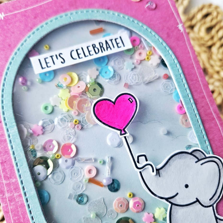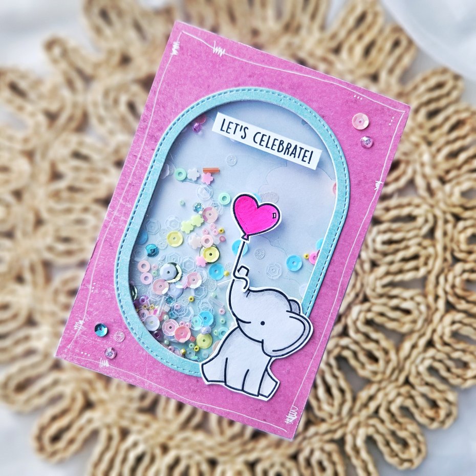 Ta urocza karteczka ma na przodzie element tzw. shaker, czyli okienko z poruszającymi się drobinkami, cekinami i innymi szeleszczącymi dodatkami. Dzięki temu podczas poruszania kartką przyjemnie szeleści przypominając grzechotkę. Na przodzie jest słonik z balonem oraz napis, który może zostać zmieniony.