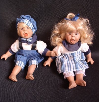 Dwie lalki kolekcjonerskie-bliźniaki-chłopiec i dziewczynka.Buzie,końcówki rączek i nóżek z porcelany.Włoski blond.Czyste i kompletnie ubrane.Stan bardzo dobry-małe zafarbowanie na rękawie chłopczyka.Wysokość lalek 28 cm.podobne na stronie www.sklebici.estranky.cz