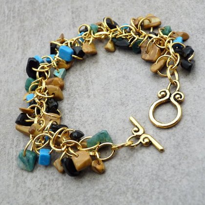 bransoletka wykonana z łańcuszka w kolorze złotym z podwieszonymi na metalowych kołach minerałami: onyksem, turkusem, jaspisem krajobrazowym i nefrytem afrykańskim, waga: 9 g, długość : 18 cm, pasuje na nadgarstek 17-17,5 cm. na życzenie mogę dopasować długość bransoletki. biżuterię wysyłam ozdobnie zapakowaną