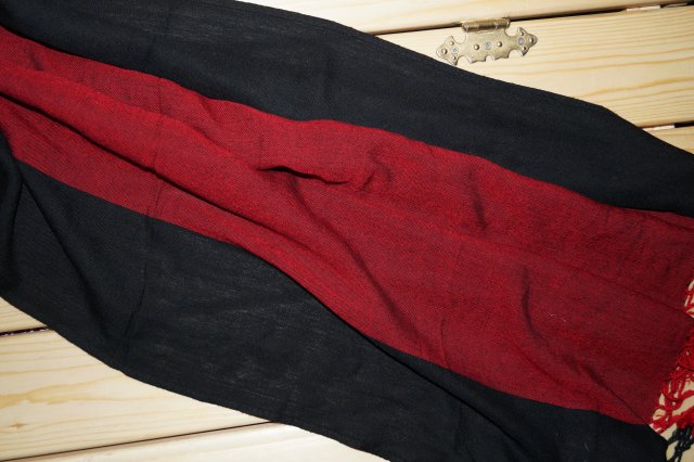 Delikatny dwukolowy szal wykonany z kaszmiru i jedwabiu, brzegi wykończone frędzelkami, wymiary:180 cm x 69 cm, miękki, lejący, ładnie się układa, dosyć cienki