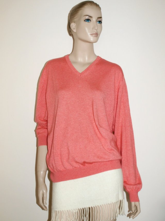 sweter vintage ekskluzywnej marki avon celli. materiał 50% kaszmir 50% jedwab. sweter cudownie jedwabisty w dotyku, w pieknym koralowym kolorze. jest prawdopodobnie męski, ale jak widac taki oversizowy fason będzie świetnie wyglądał na paniach. brak metki z rozmiarem, na manekinie o rozmiarze 38. raczej na wyższą osobę. niestety ma feler (zdjęcia ), na dole jednego z rękawów dwa małe zeszycia (stąd taka cena, sklepowe ceny zwalają z nóg). Oczywiście przy opcji zawiniety rękaw, będzie wyglądał bardzo dobrze. Podaję wymiary mierzone na płasko;