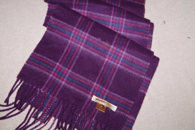 Piękny kaszmirowy szal ekskluzywnej marki JOHNSTONS, made in Scotland, cudne kolory: śliwka, lila, malinowy, morski, motyw kraty, delikatny i miękki, bardzo dobry gatunek, 100% kaszmir, cena sklepowa: ok 140 EURO
