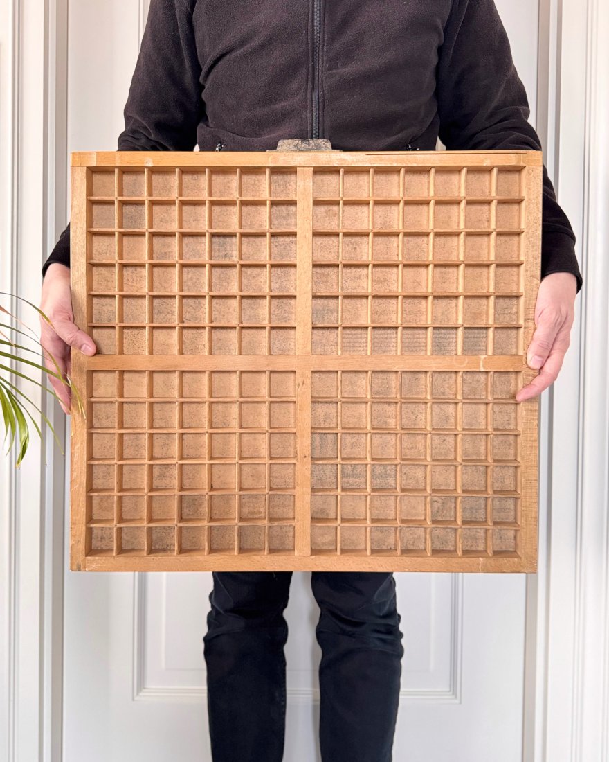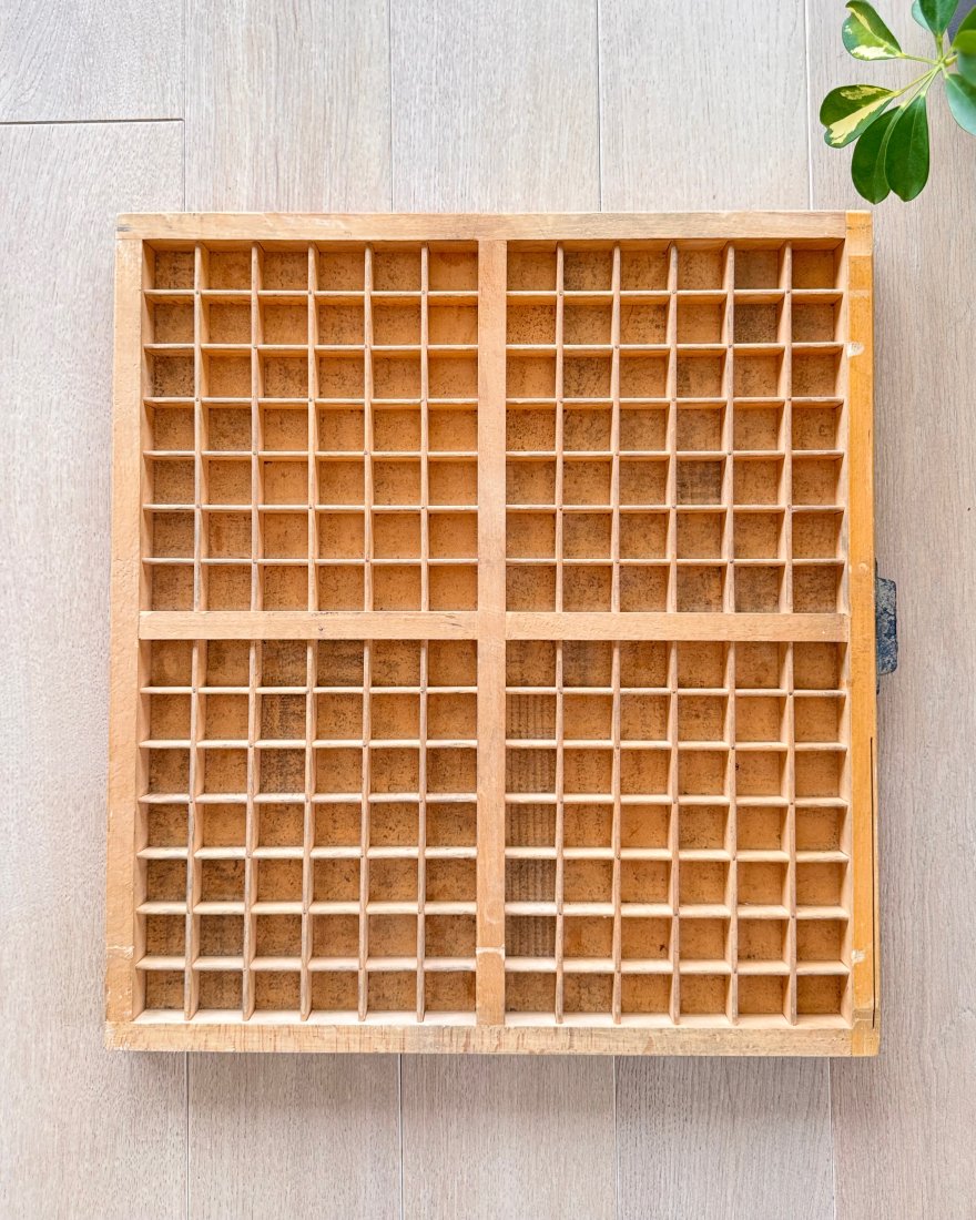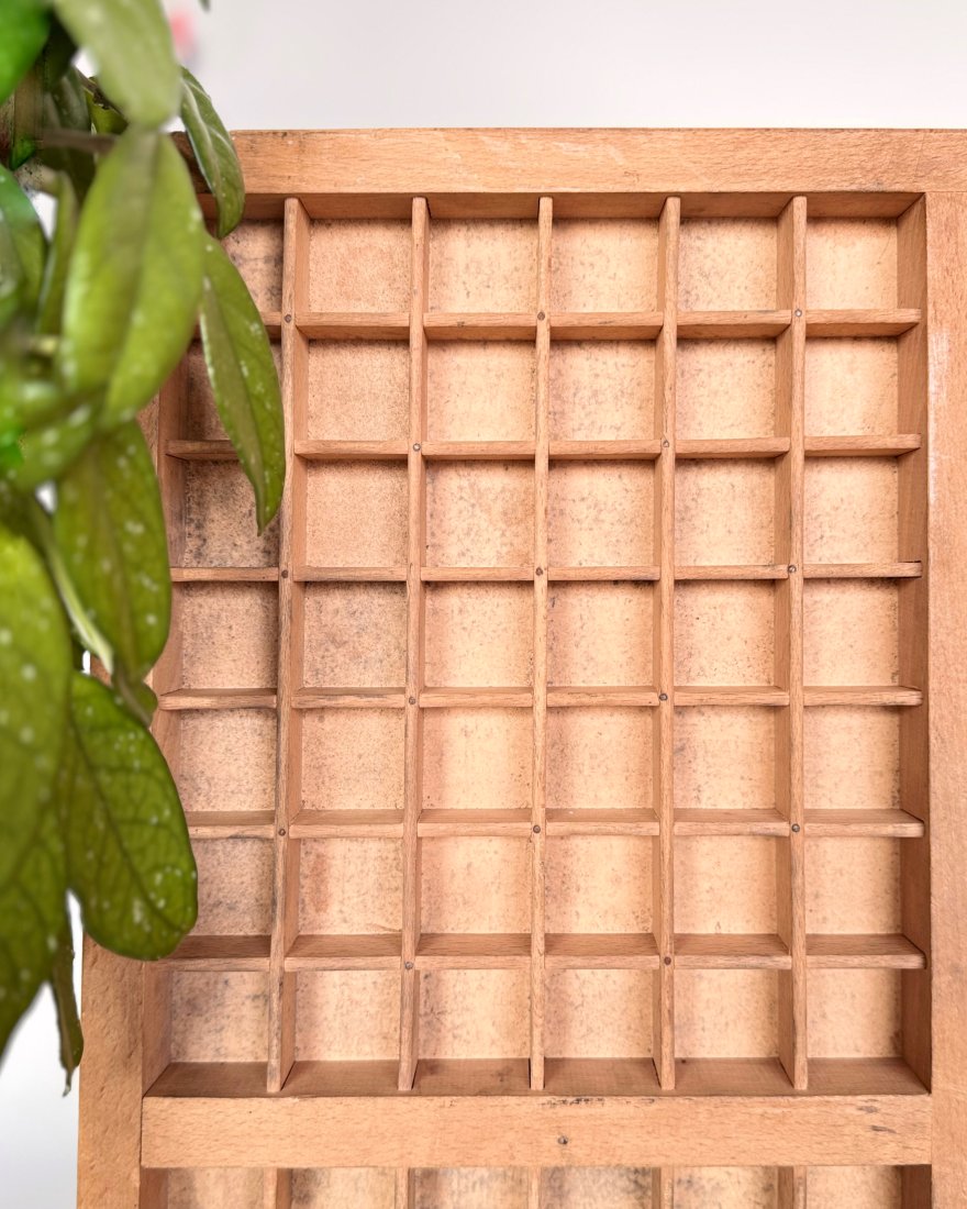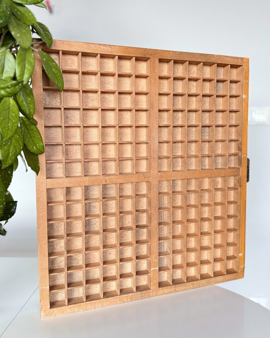 Stara szuflada drukarska, tzw. kaszta, drewniana, która oryginalnie służyła do przechowywania czcionek drukarskich.