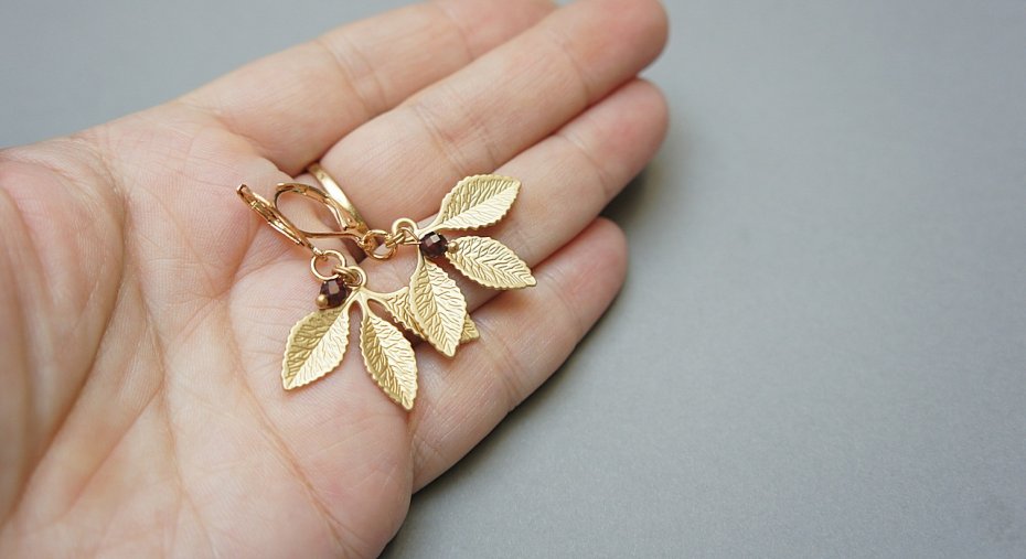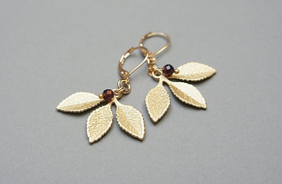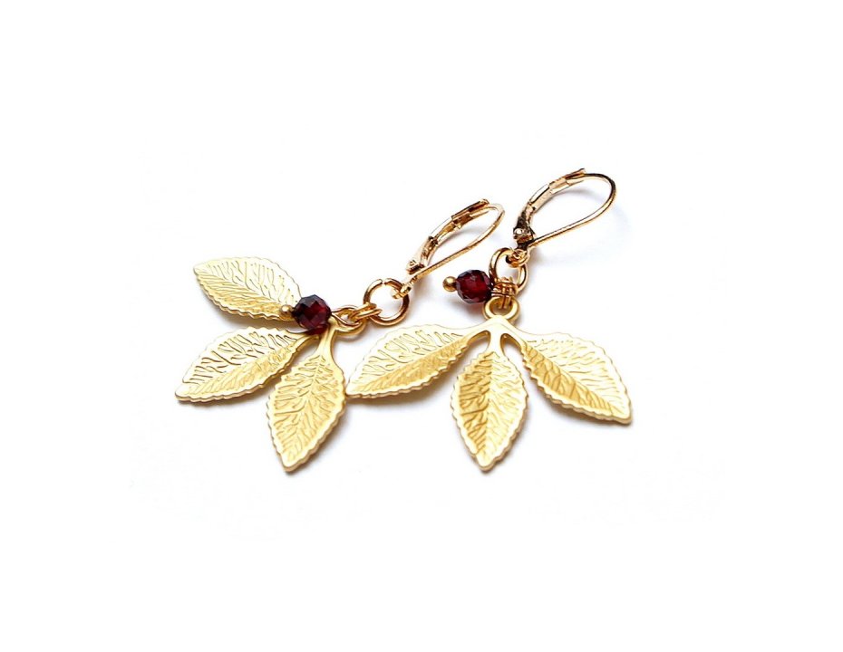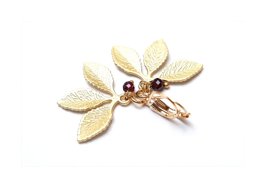 Kolczyki wykonane z naturalnych kamieni - granatów fasetowanych [4mm] oraz pozostałych elementów metalowych w kolorze złotym. Wielkość liści: 31 x 23mm. Długość kolczyków ok. 4,4cm. Biżuteria ozdobnie zapakowana.