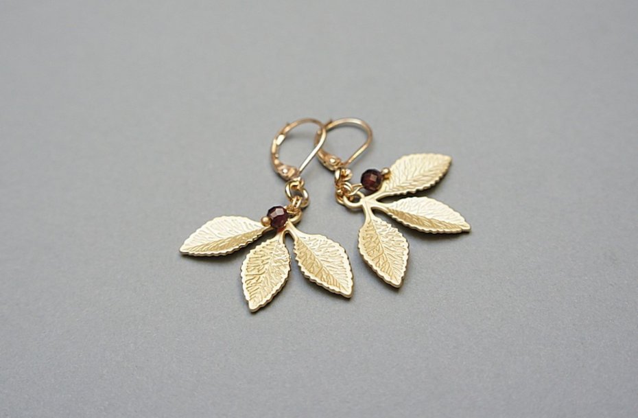 Kolczyki wykonane z naturalnych kamieni - granatów fasetowanych [4mm] oraz pozostałych elementów metalowych w kolorze złotym. Wielkość liści: 31 x 23mm. Długość kolczyków ok. 4,4cm. Biżuteria ozdobnie zapakowana.